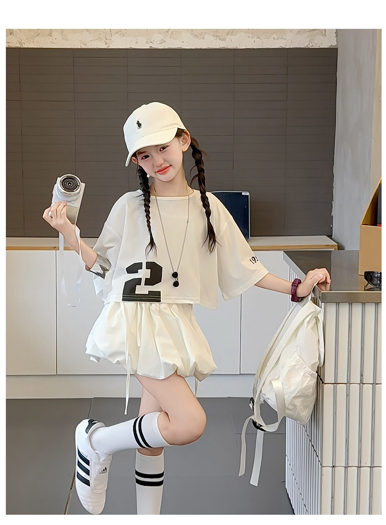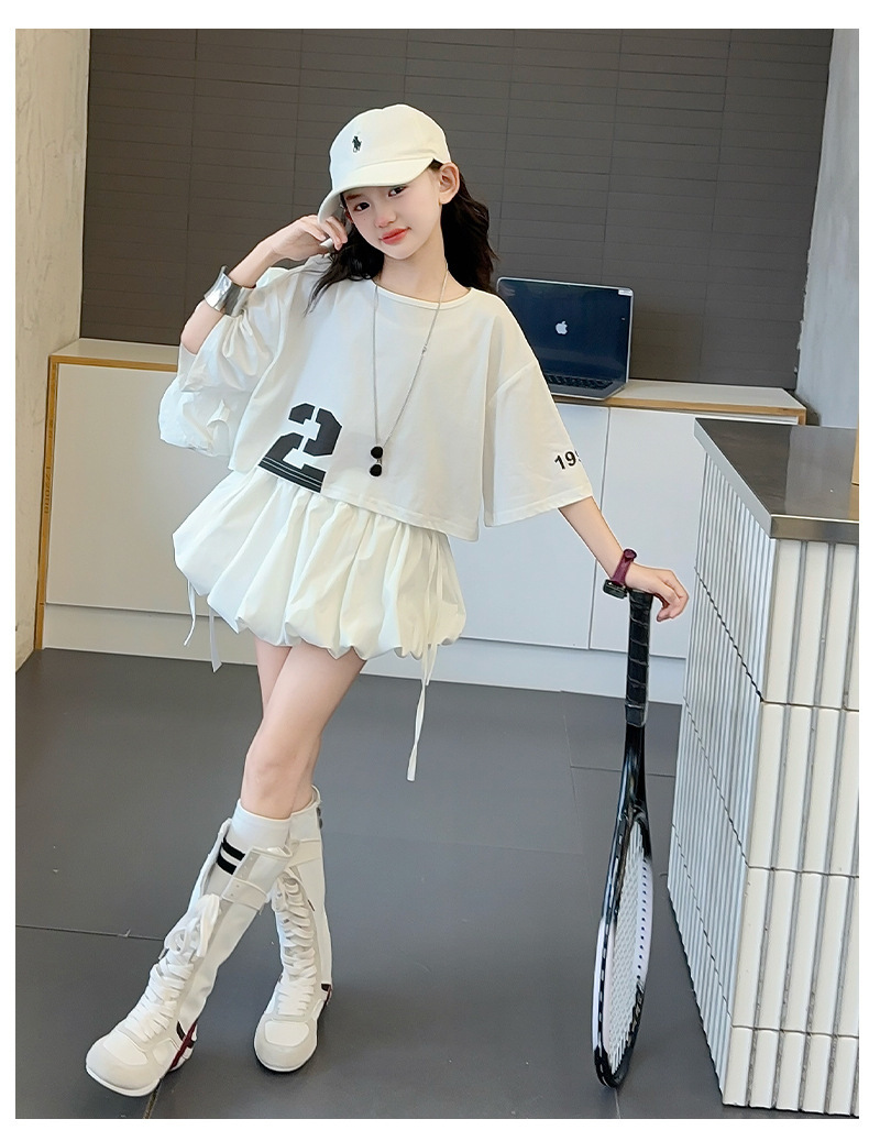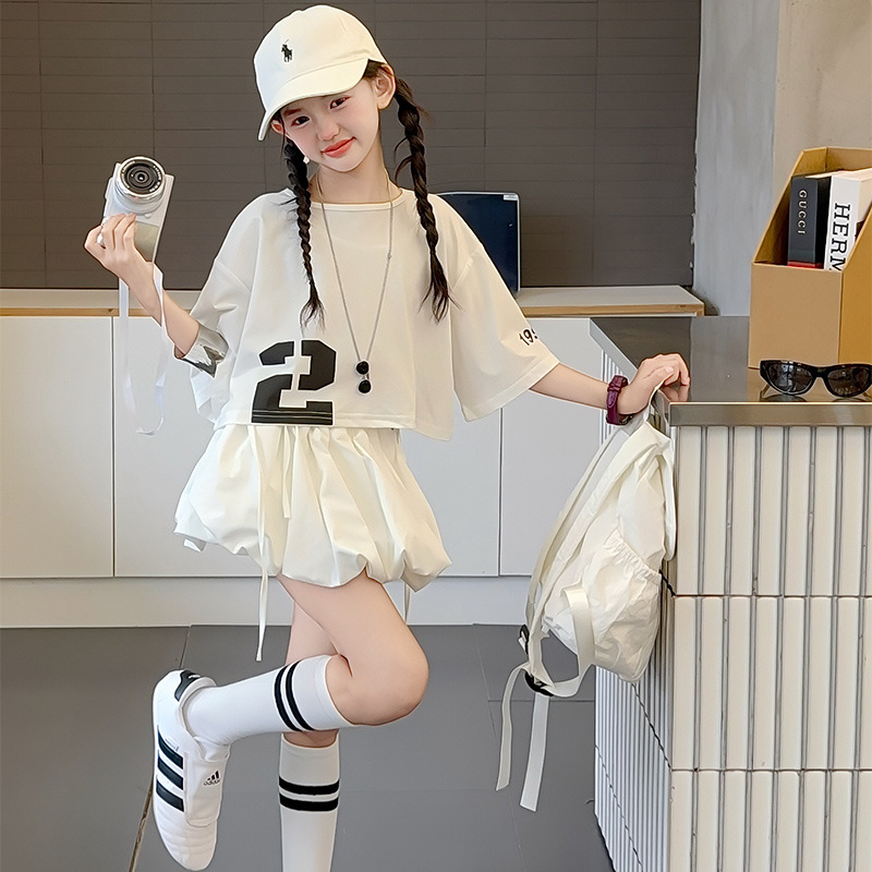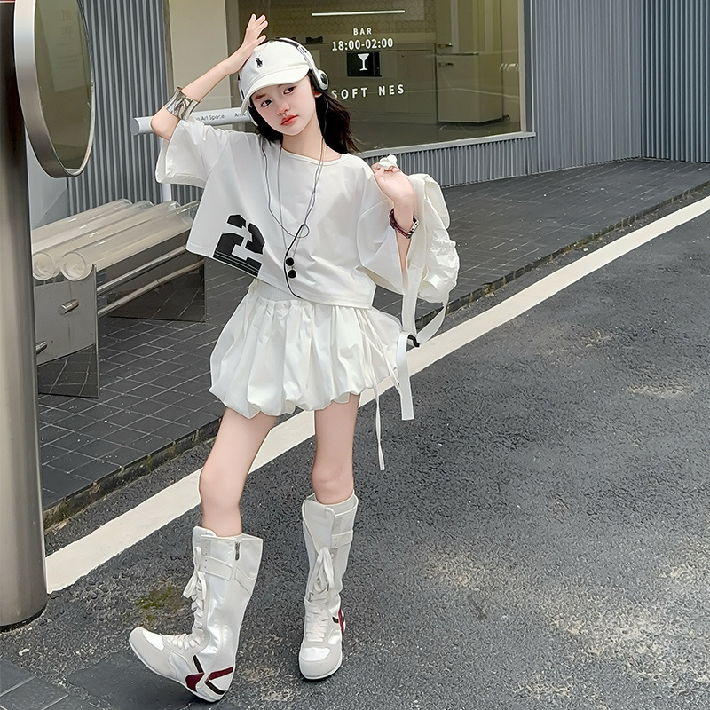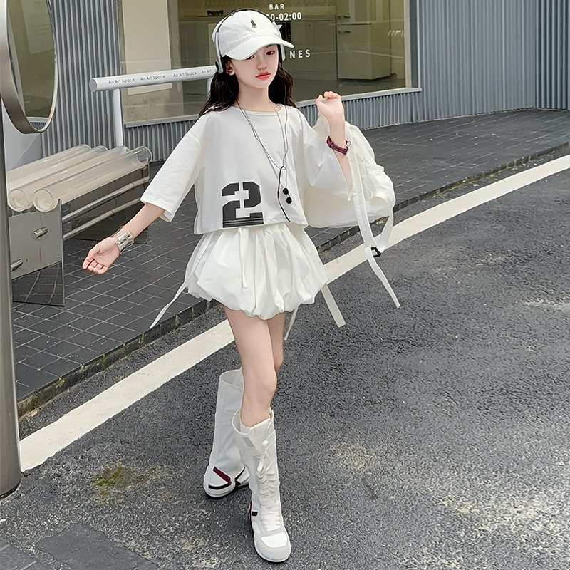 여자 여름 짧은 티셔츠 세트 2025 새로운 여름 스타일 중대형 어린이 유행 흰색 버블 스커트 투피스 세트