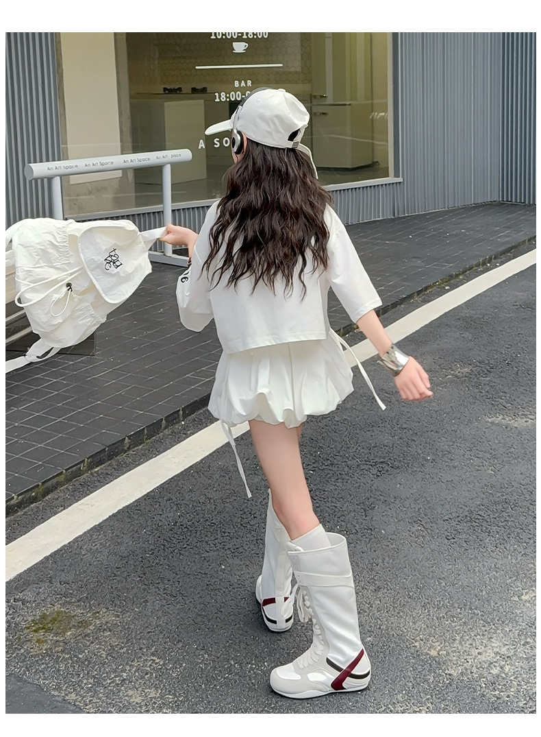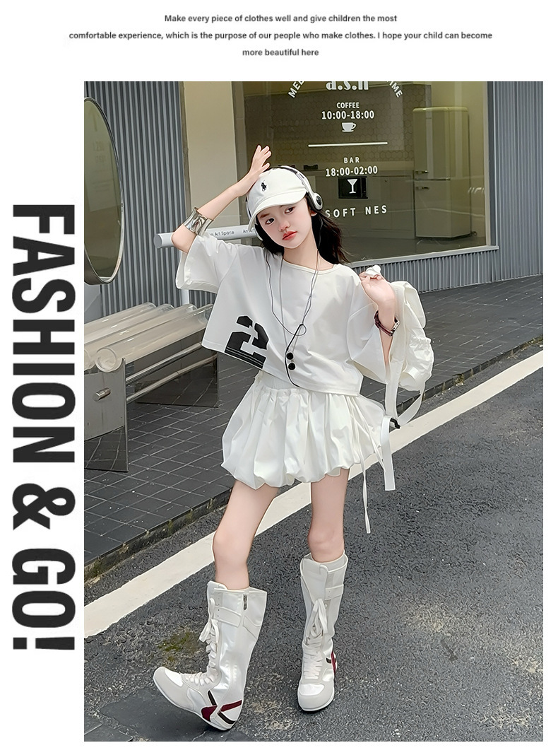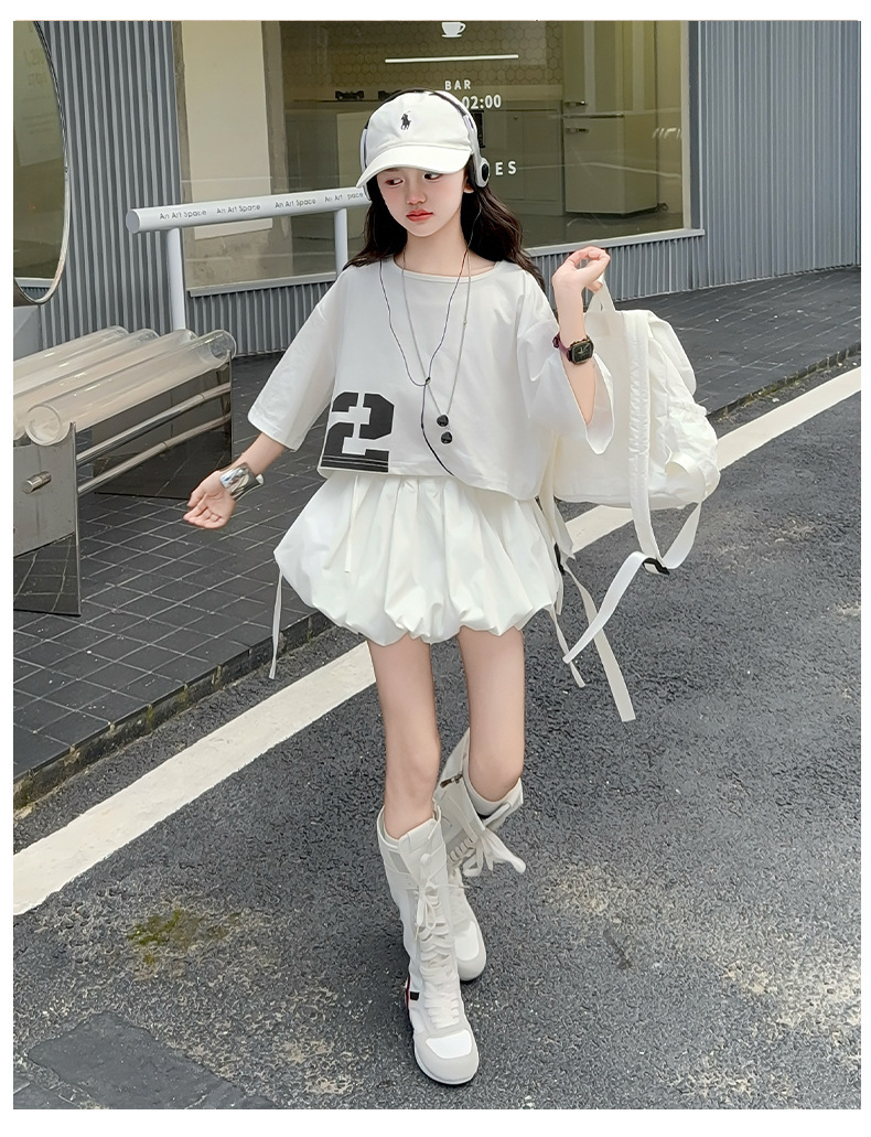 여자 여름 짧은 티셔츠 세트 2025 새로운 여름 스타일 중대형 어린이 유행 흰색 버블 스커트 투피스 세트스토어 가기