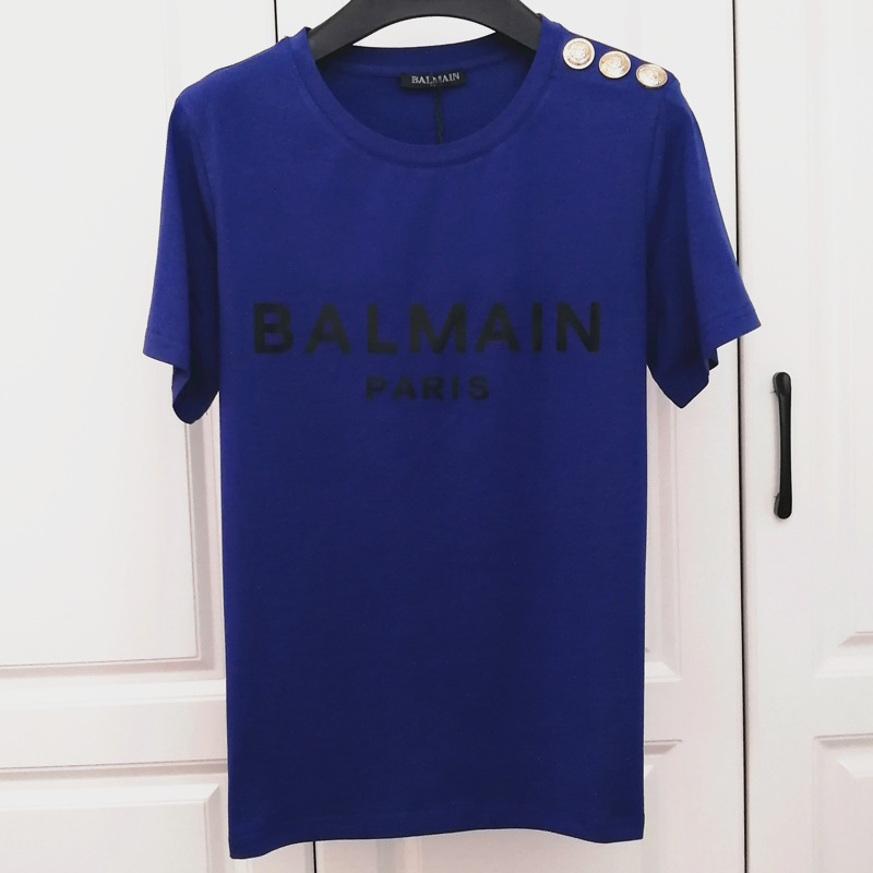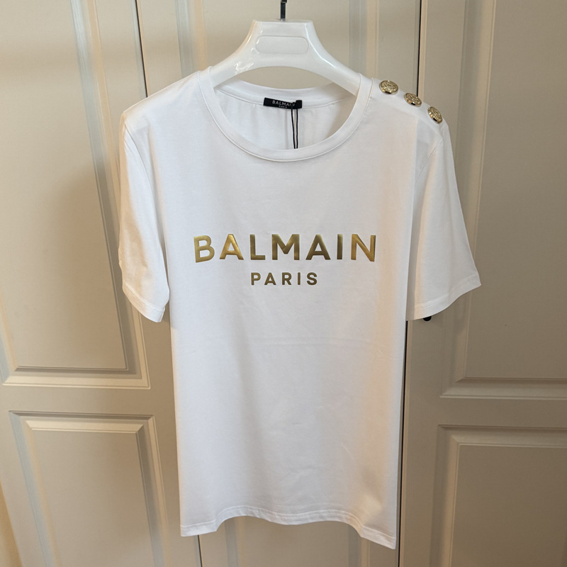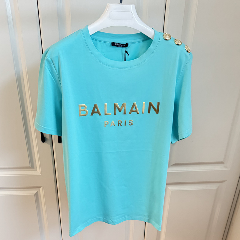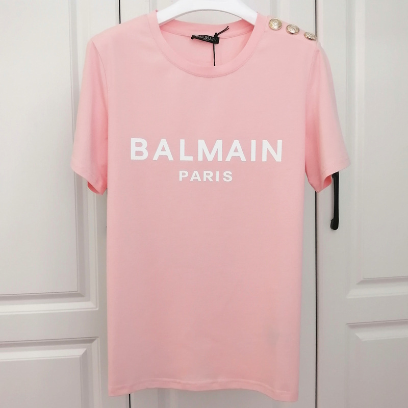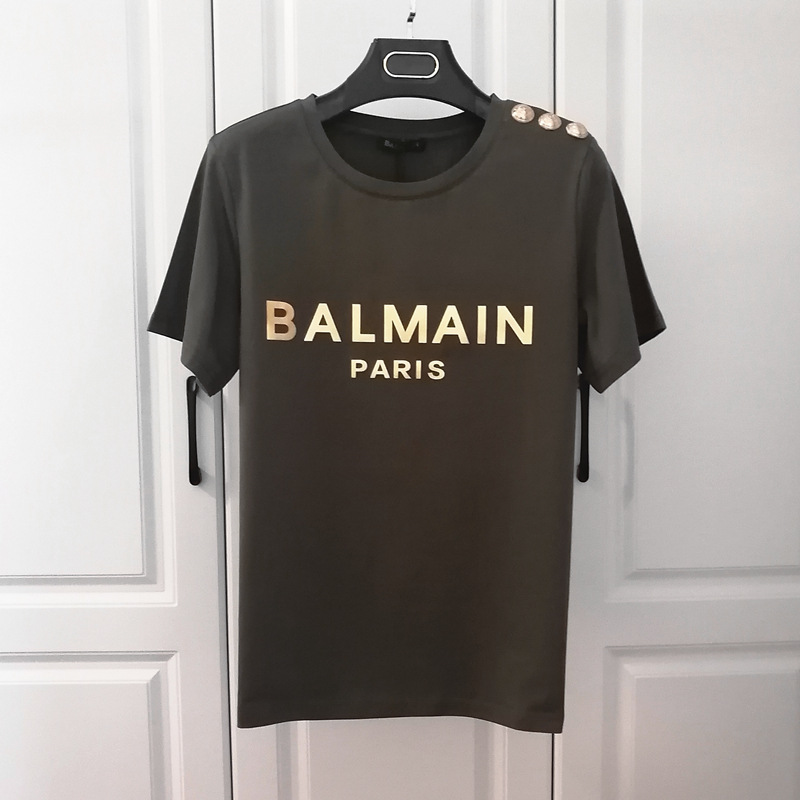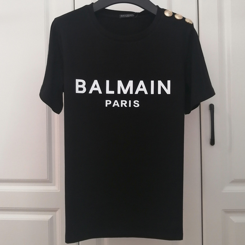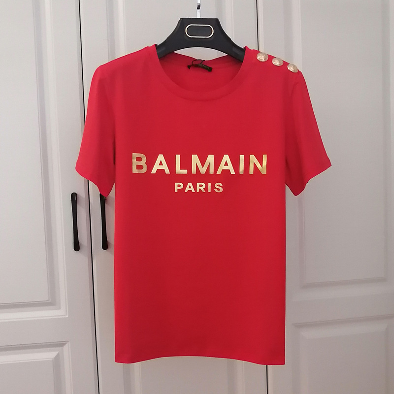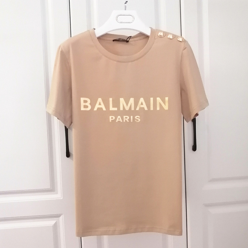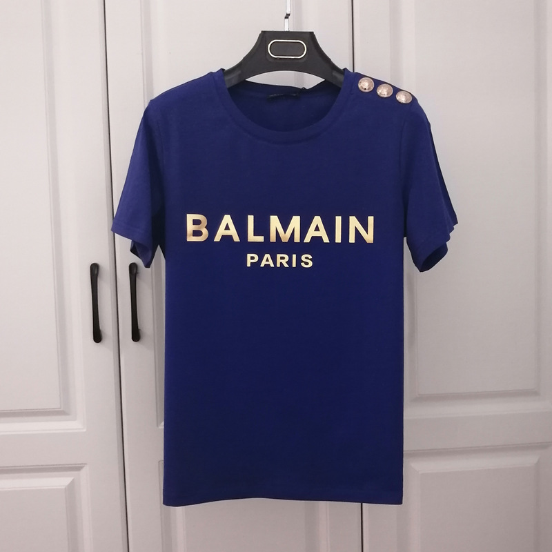 발망 티셔츠 핫 스탬핑 프린트 레터 봄 여름 신작 반팔 코튼 숄더 골드 버클 발망 패션 여성 의류스토어 가기