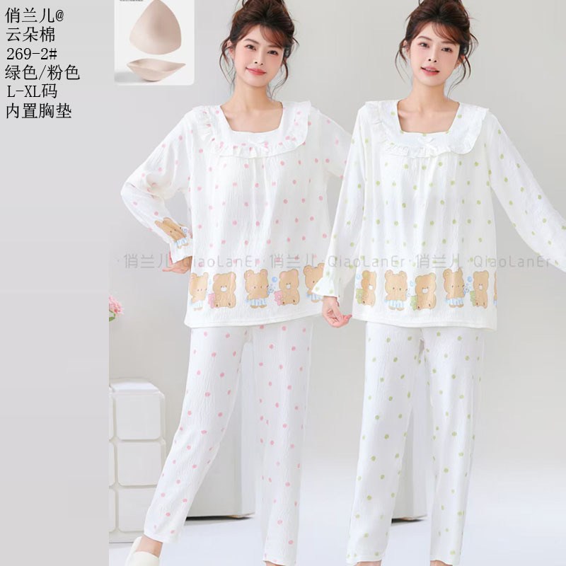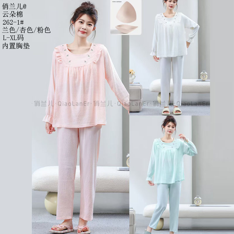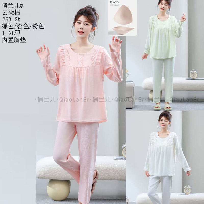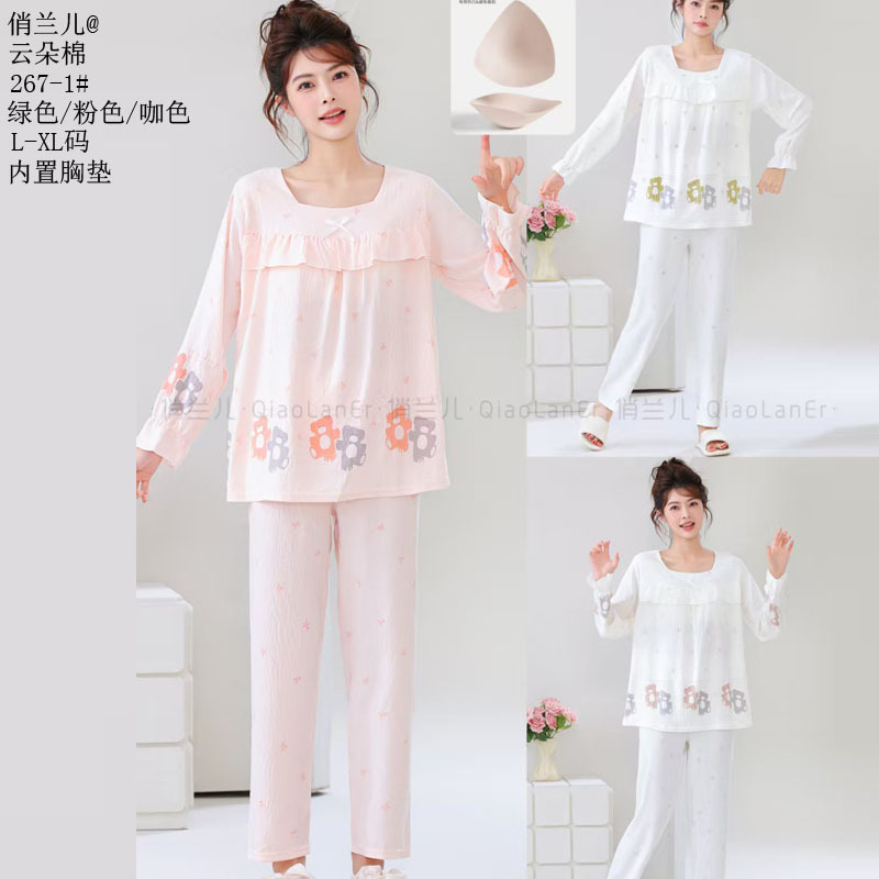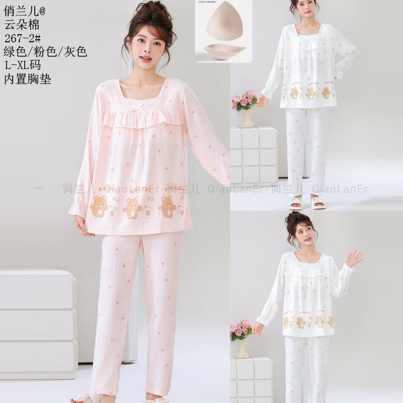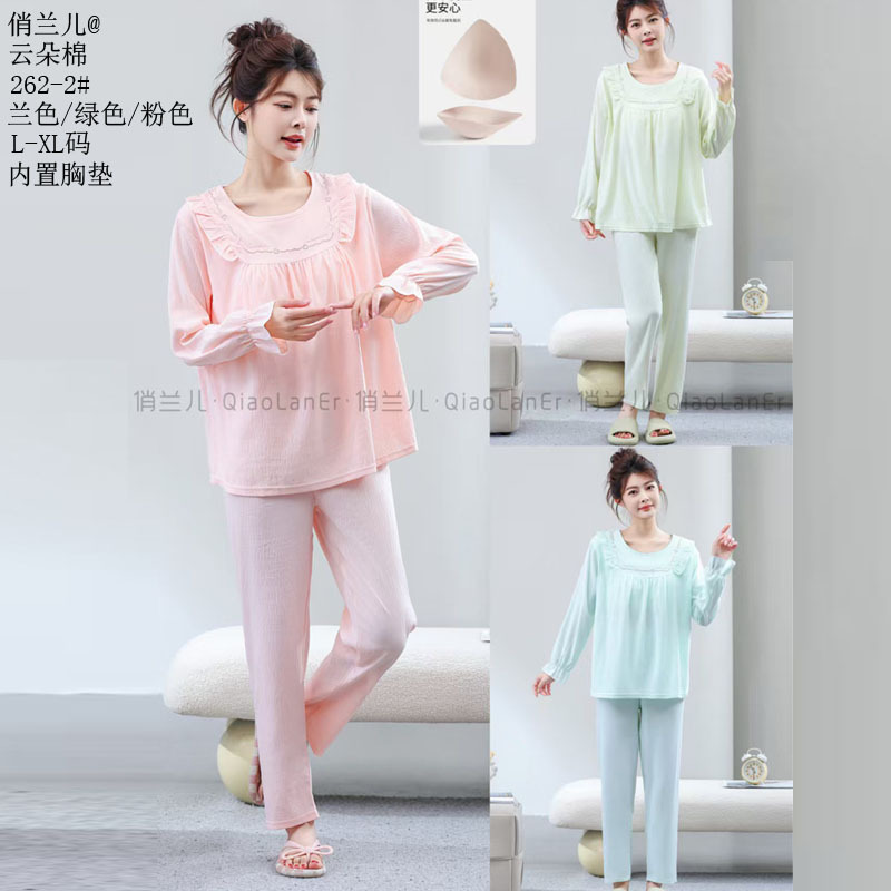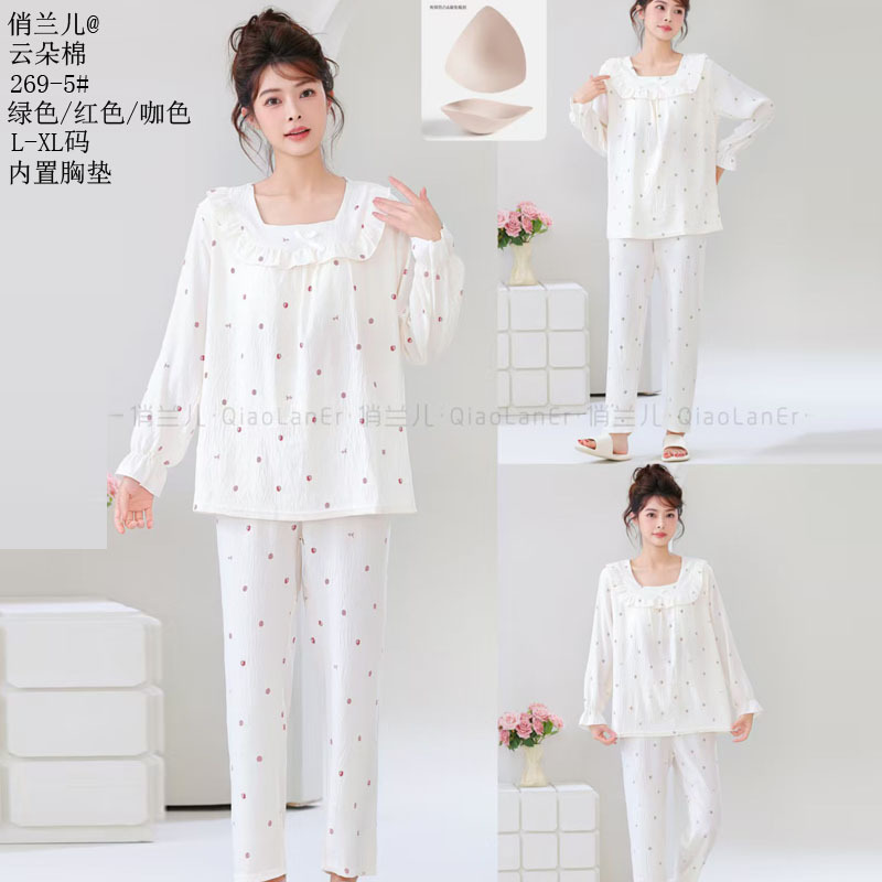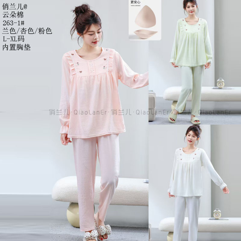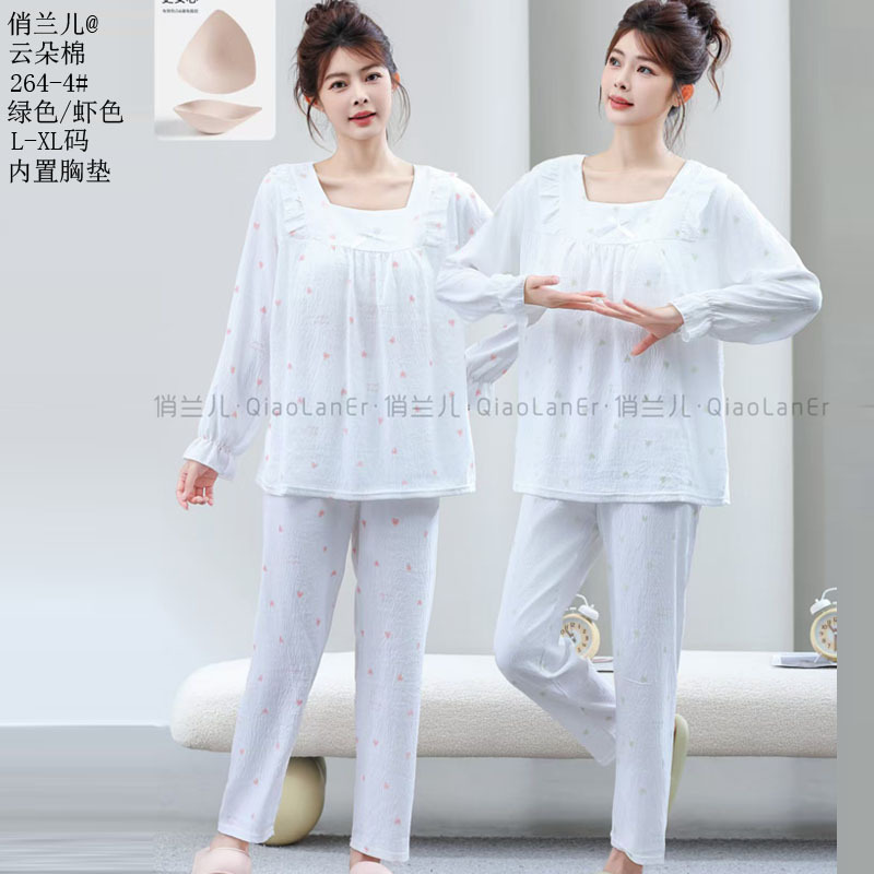 Qiaolan'er Yunduo 면 2025 새로운 역방향 풀오버 긴팔 바지 내장 가슴 패드 잠옷 여성 패션 홈웨어