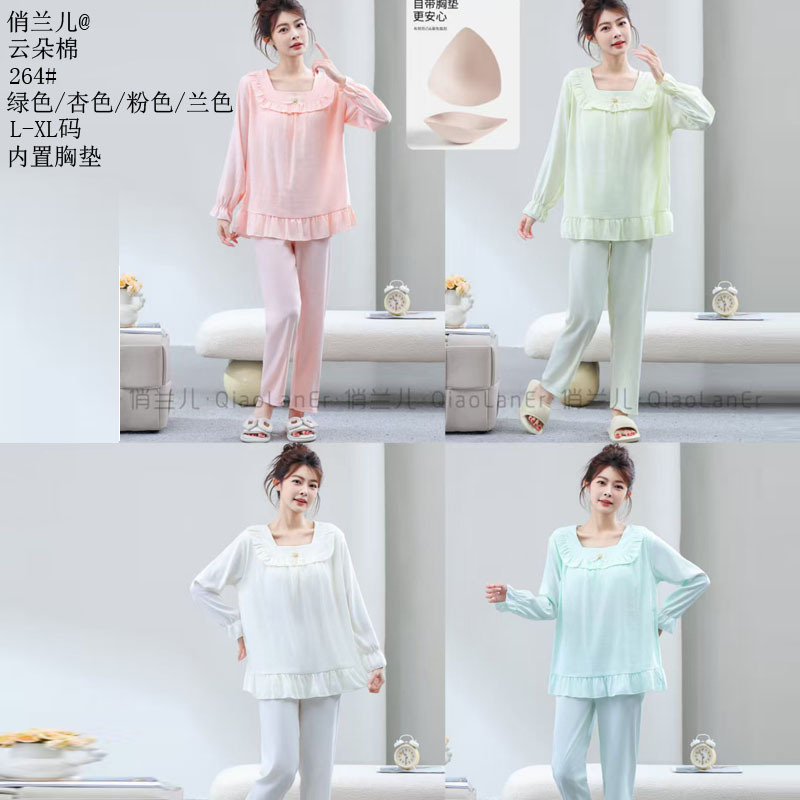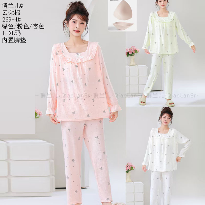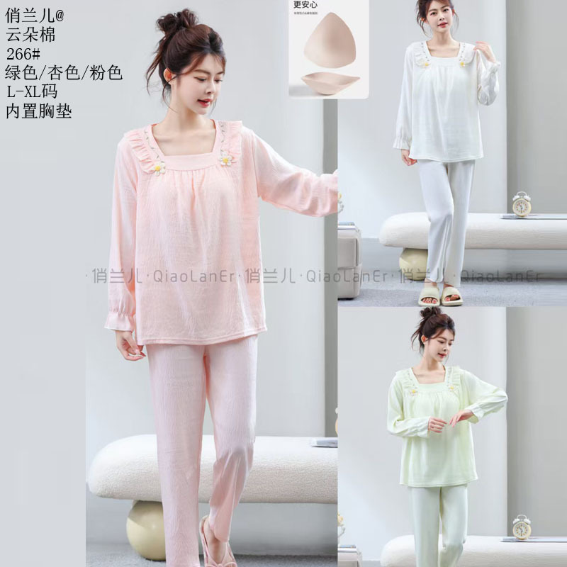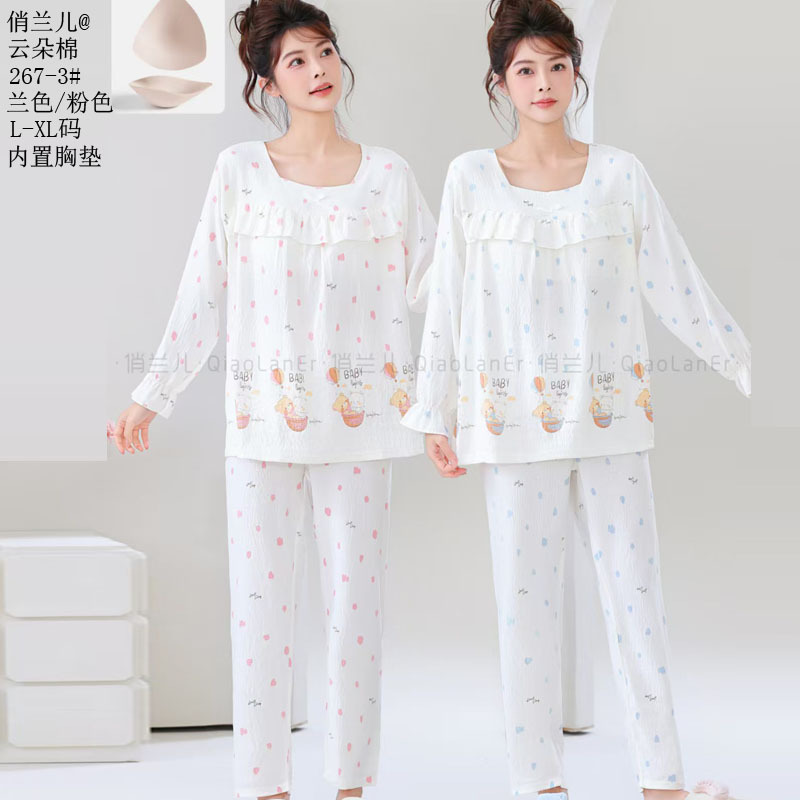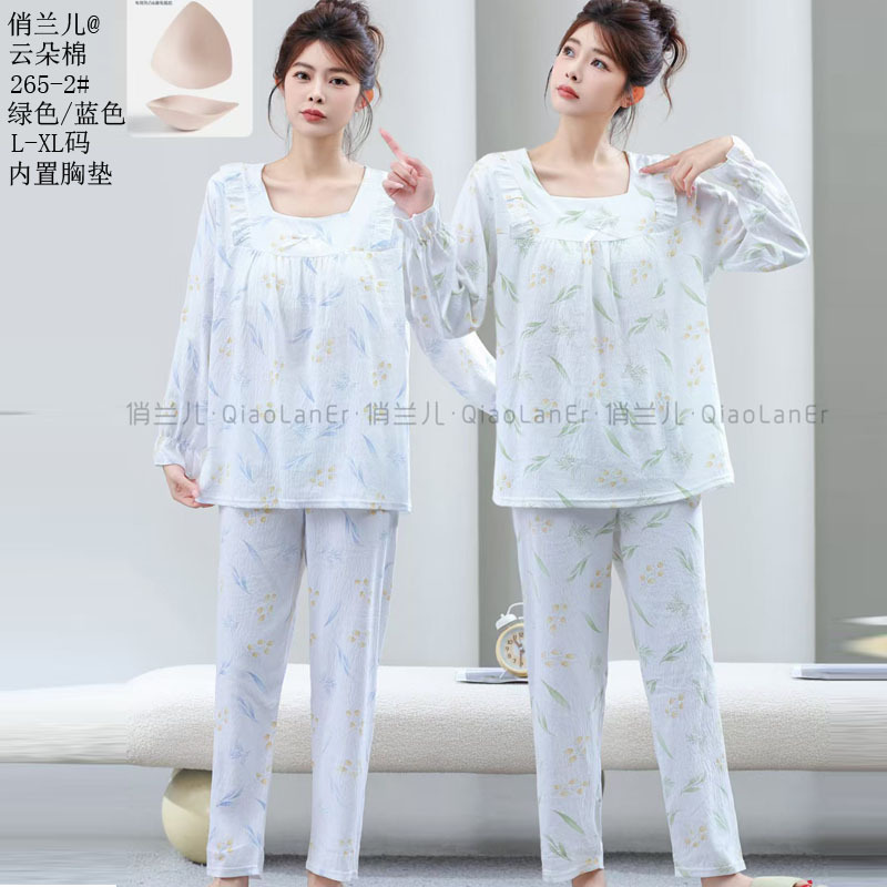 Qiaolan'er Yunduo 면 2025 새로운 역방향 풀오버 긴팔 바지 내장 가슴 패드 잠옷 여성 패션 홈웨어스토어 가기