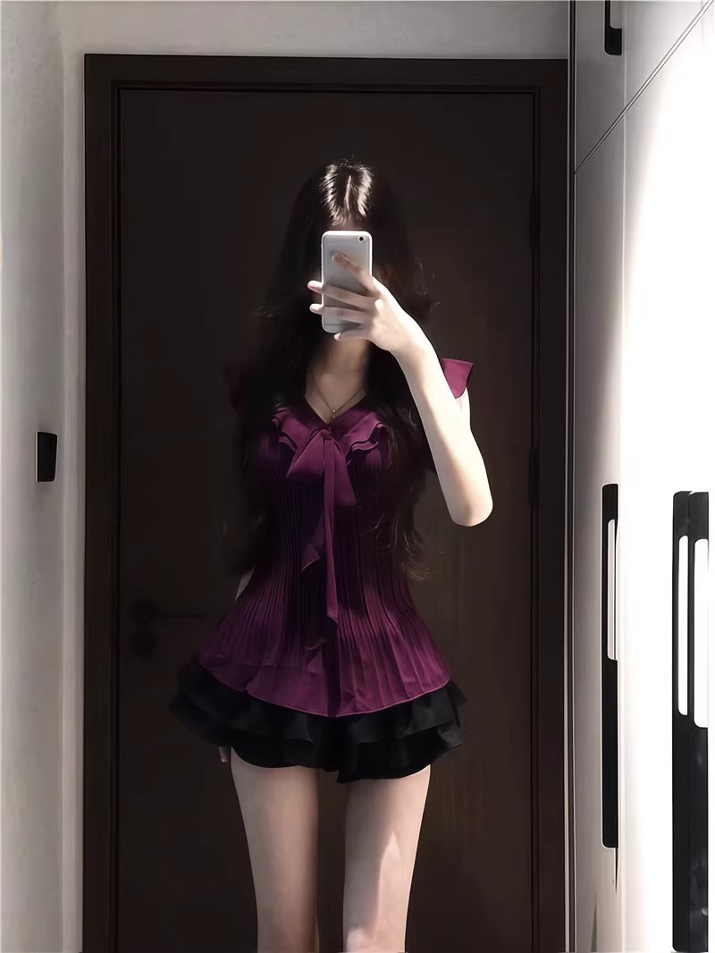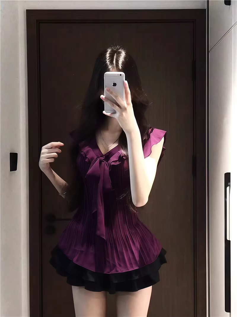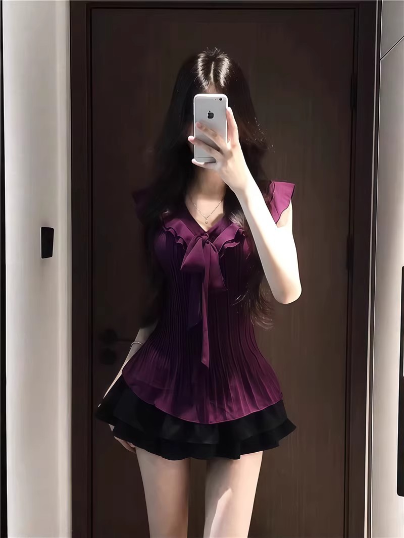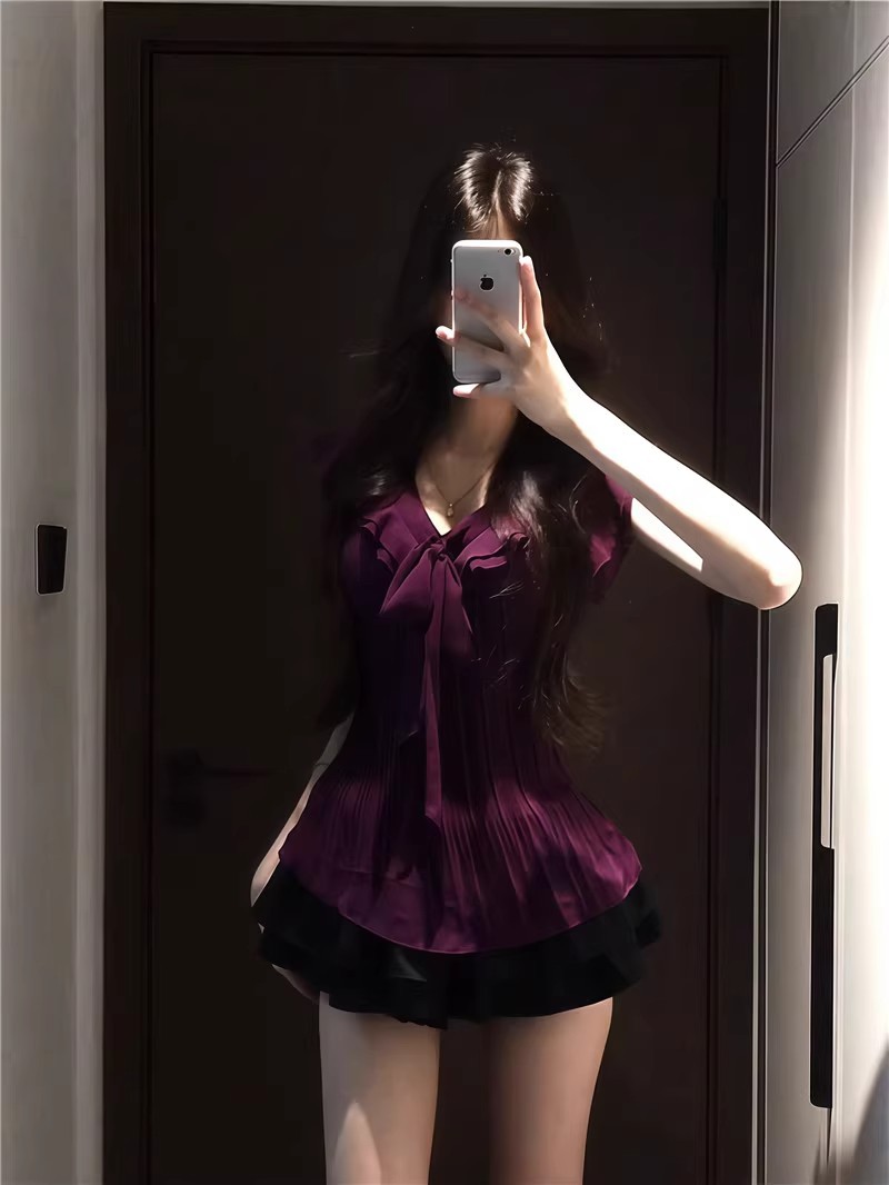 여성을위한 보라색 프릴 쉬폰 셔츠 2025 여름 새로운 스타일 보우 타이 플리츠 탑 여성용 셔츠