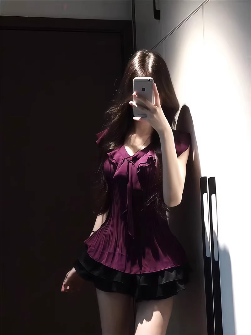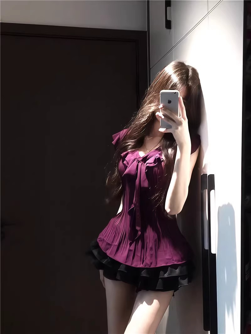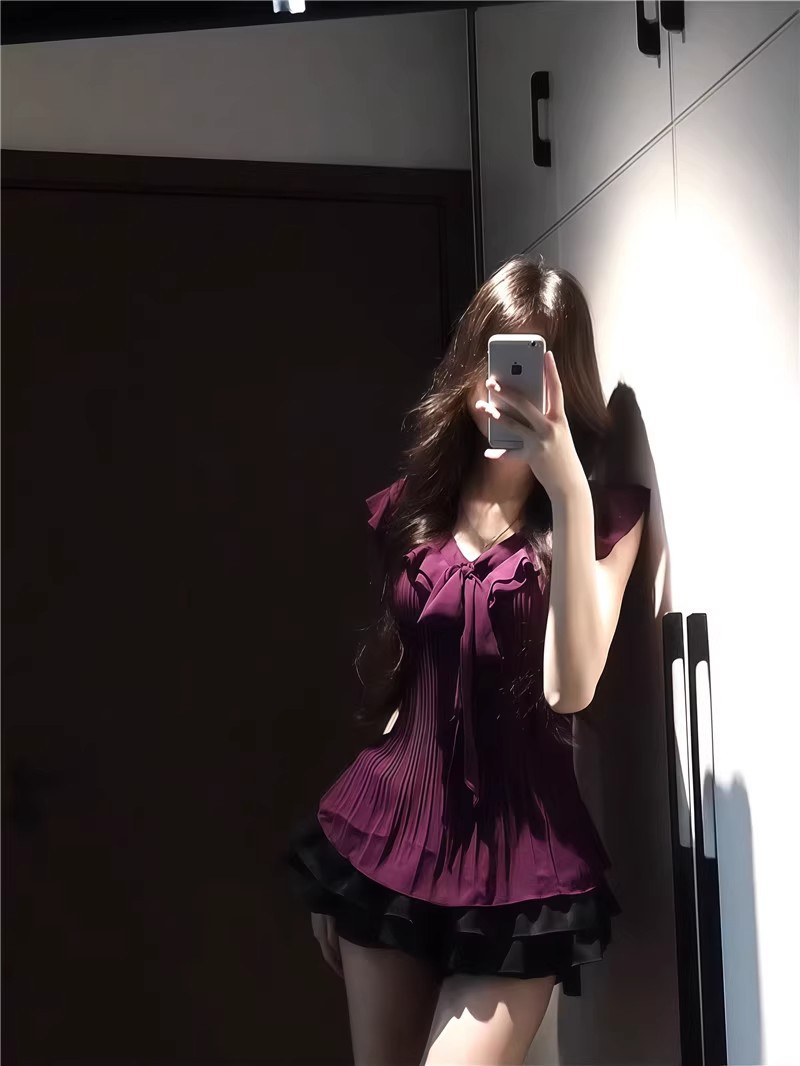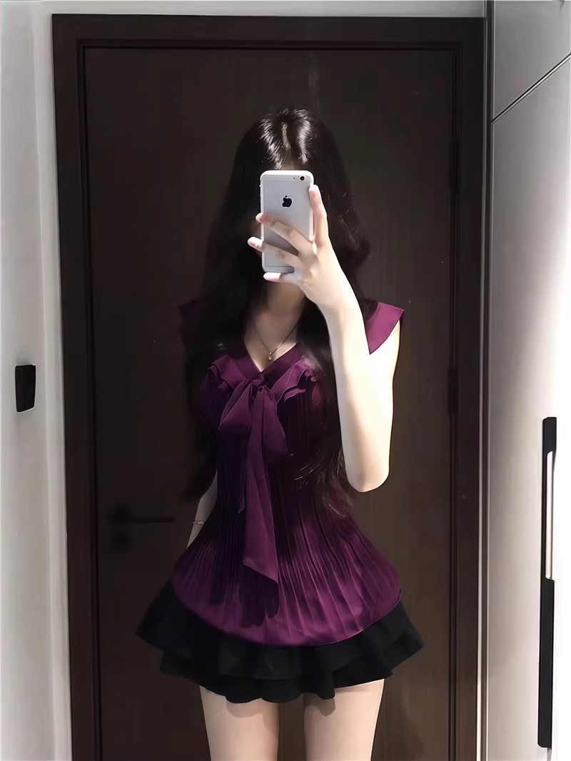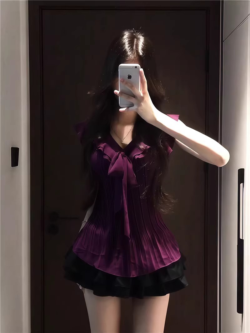 여성을위한 보라색 프릴 쉬폰 셔츠 2025 여름 새로운 스타일 보우 타이 플리츠 탑 여성용 셔츠