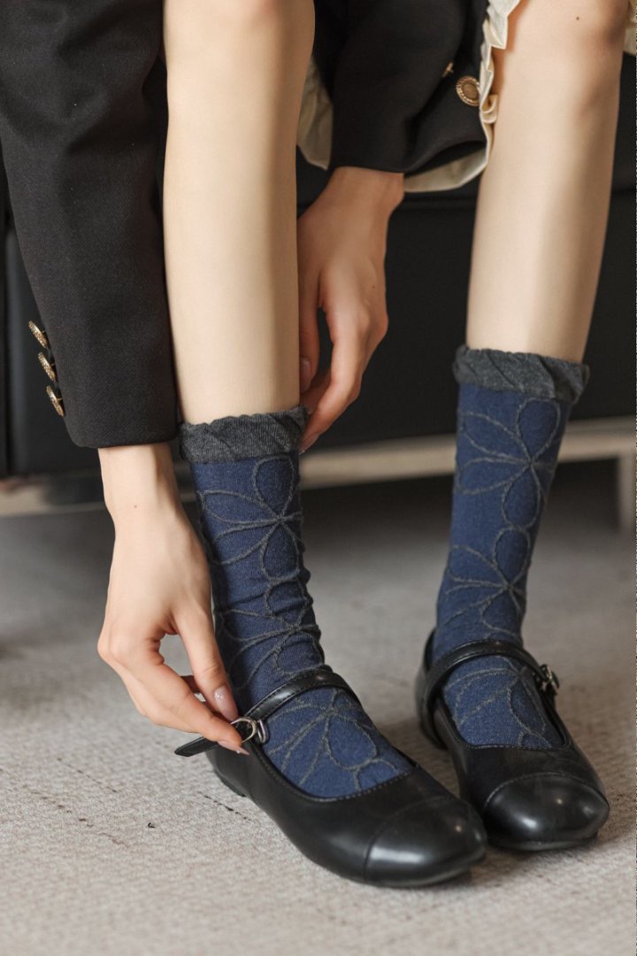 Xiaohongshu 같은 분위기의 여성용 양말, 네이비 블루 본리스 복고풍 여성용 종아리 중간 양말, 클래식 캐주얼 양말 도매스토어 가기