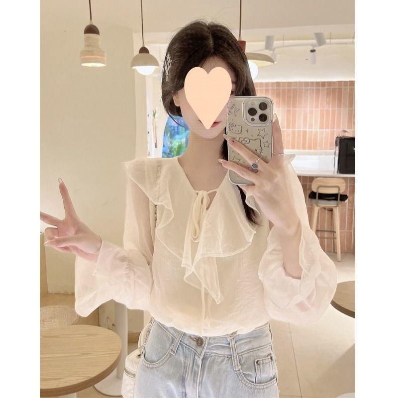 여성을위한 프랑스 스타일의 작은 향기 칼라 프릴 쉬폰 셔츠 봄 새로운 디자인 틈새 가벼운 성숙한 탑 셔츠스토어 가기