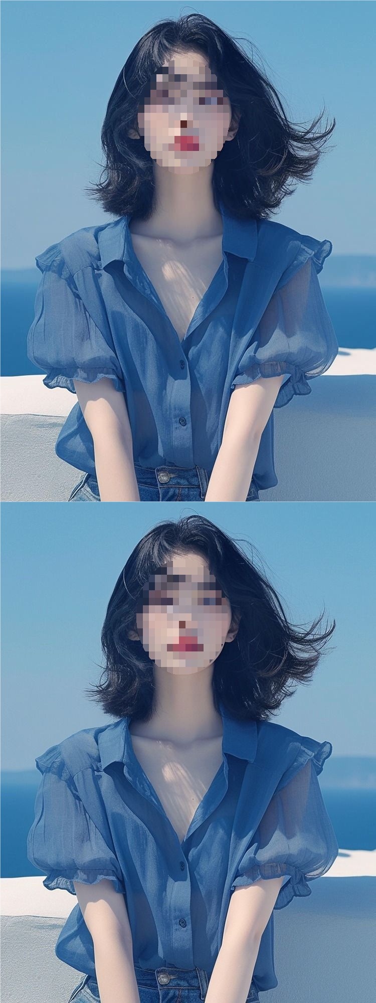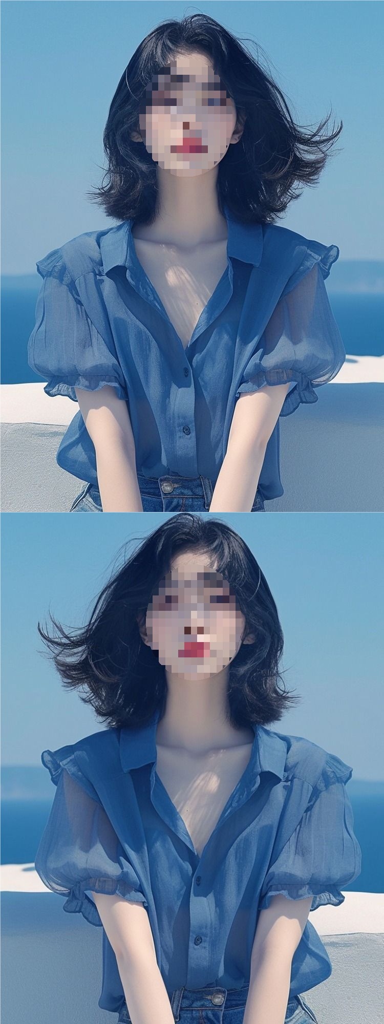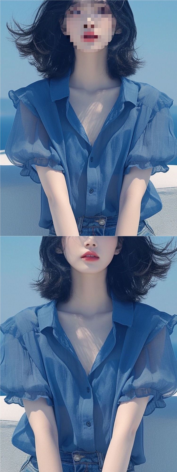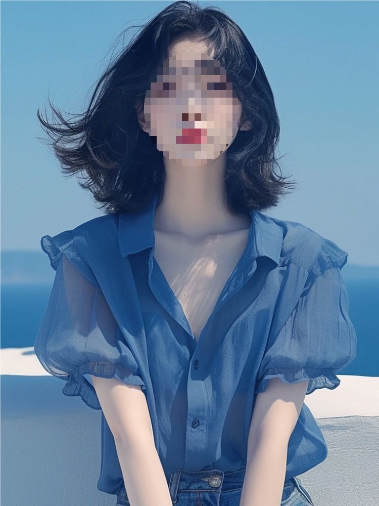 여름 여성을 위한 프렌치 스타일 블루 퍼프 슬리브 쉬폰 셔츠, 새로운 스타일의 살을 커버하고 날씬해 보이는 탑, 나이를 줄여주는 얇은 셔츠스토어 가기