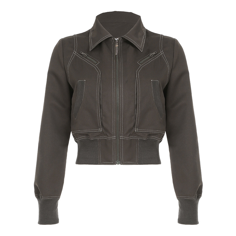 새로운 유럽과 미국의 지퍼 슬리밍 재킷 우븐 재킷 크로스 보더 여성 허리 슬림 포켓 복고풍 작업복 탑