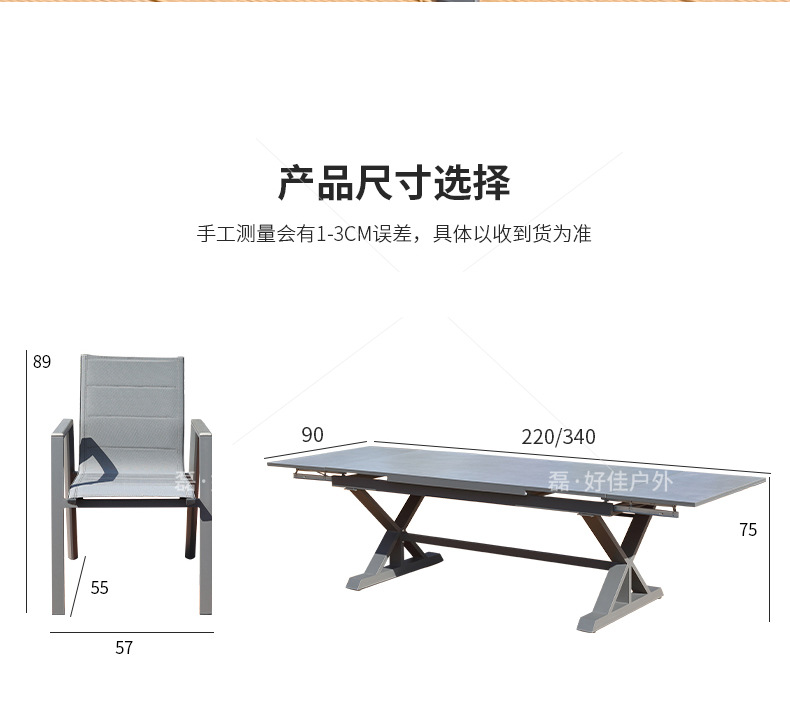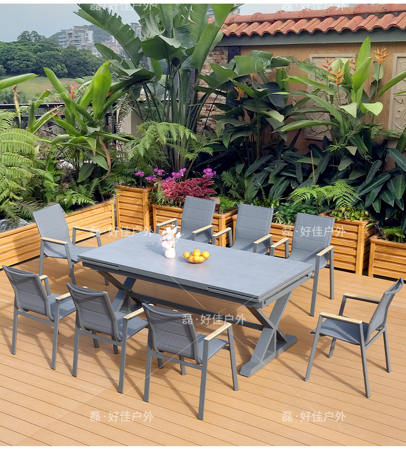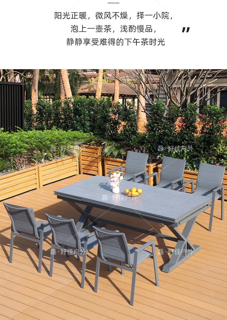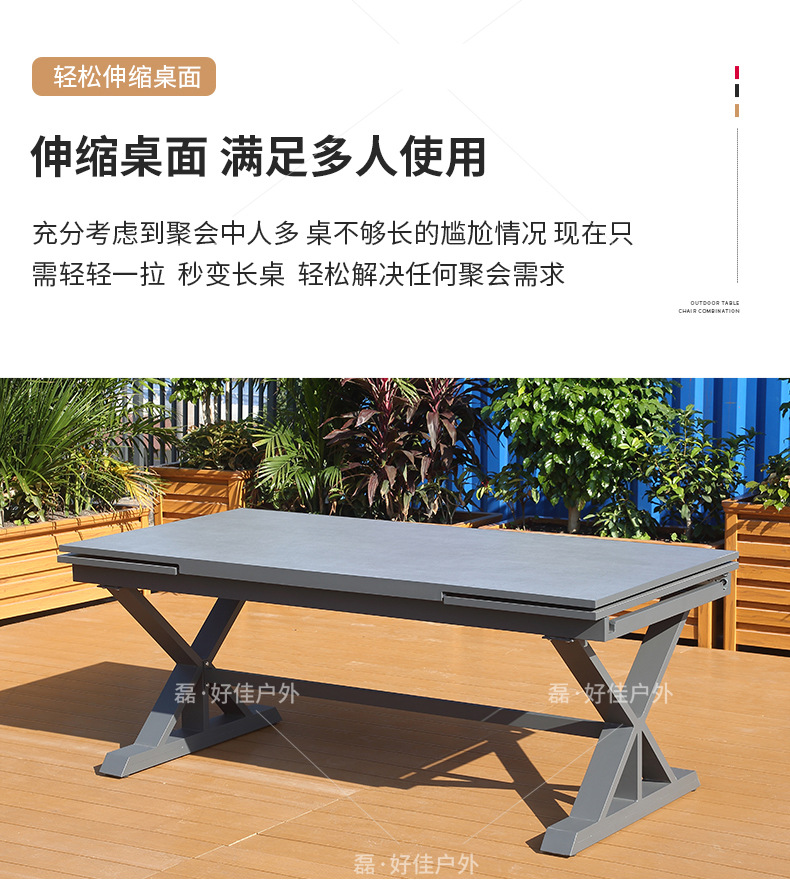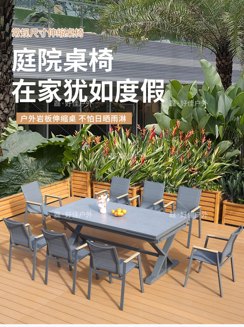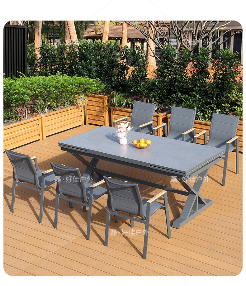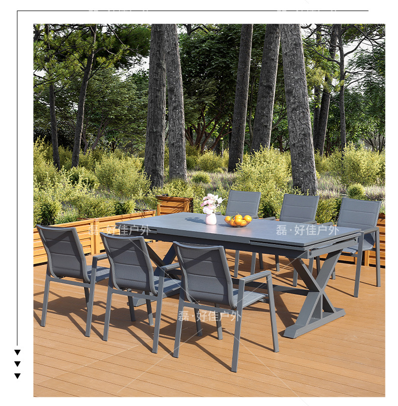 • 6개의 더블 레이어 메쉬 의자 + 220(확장 340) * 90cm 텔레스코픽 록 플레이트 롱 테이블