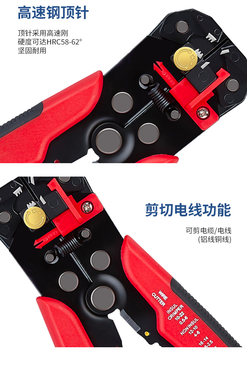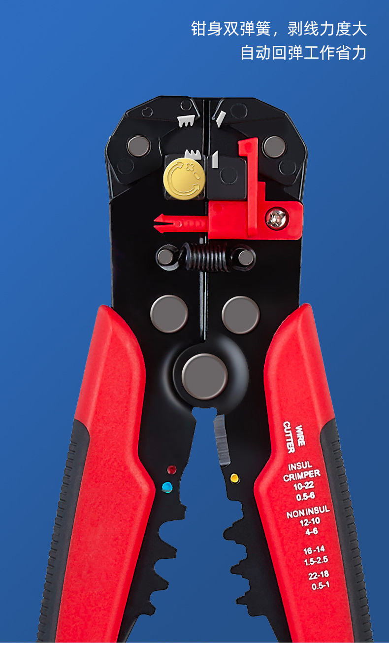 规格特点:适用于AWG10-24(0.2-6平方mm)的线圈,带导尺的区别是可以精确剥线长度,是集剥线、剪线、压接等为一体的多功能钳