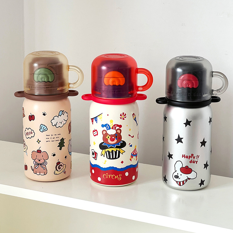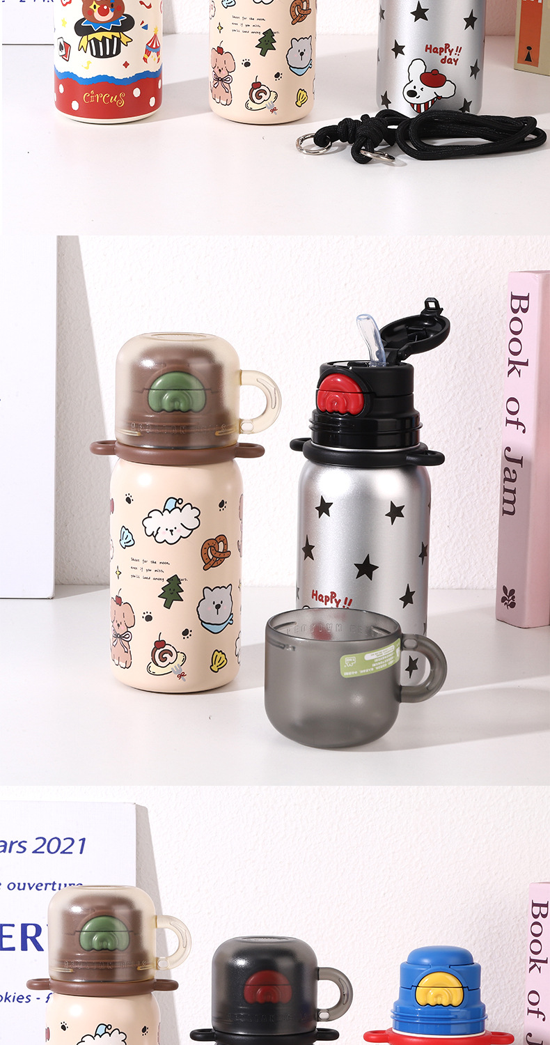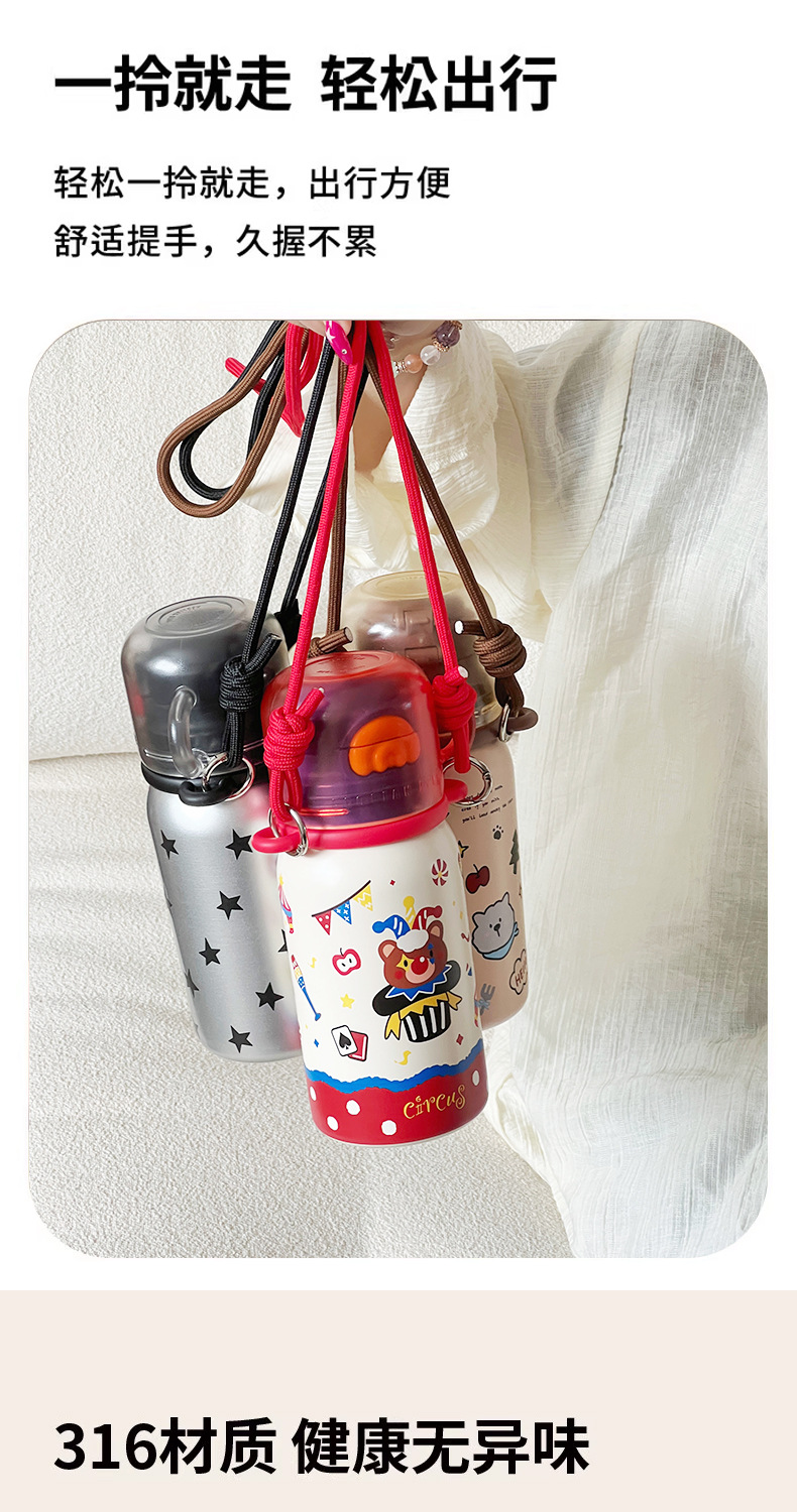 만화 반투명 3가지 음료 보온병 컵 316 스테인레스 스틸 고급스러운 학생 물컵 학교 휴대용 로프 컵