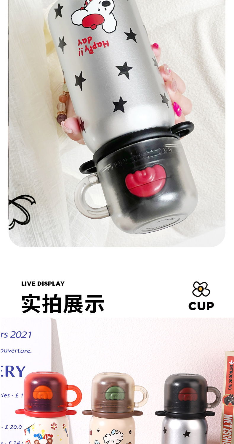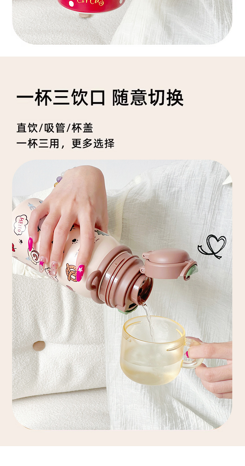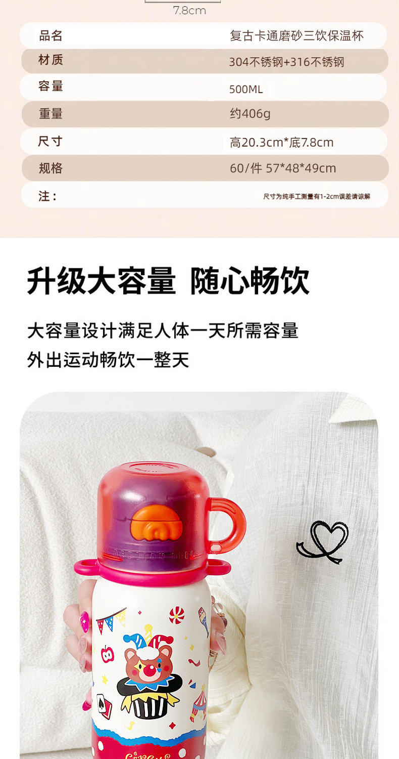 만화 반투명 3가지 음료 보온병 컵 316 스테인레스 스틸 고급스러운 학생 물컵 학교 휴대용 로프 컵