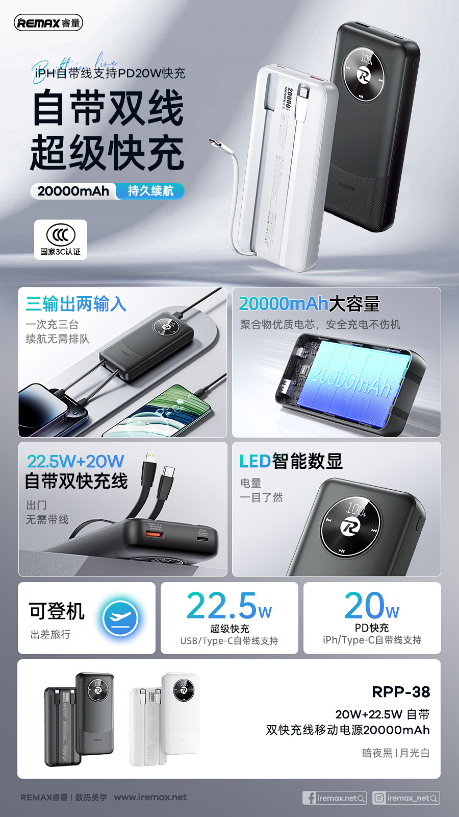 remax 自带双线20000毫安快充充电宝 手机快充自带线移动电源3C