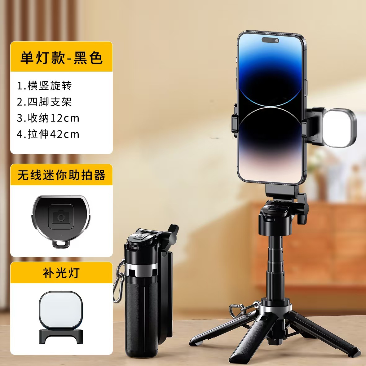 • M1 블랙 (블루투스 리모컨 + 사각 드래곤 뼈대 거치대 + 키링 + 신축봉 + 싱글 뷰티 조명)
