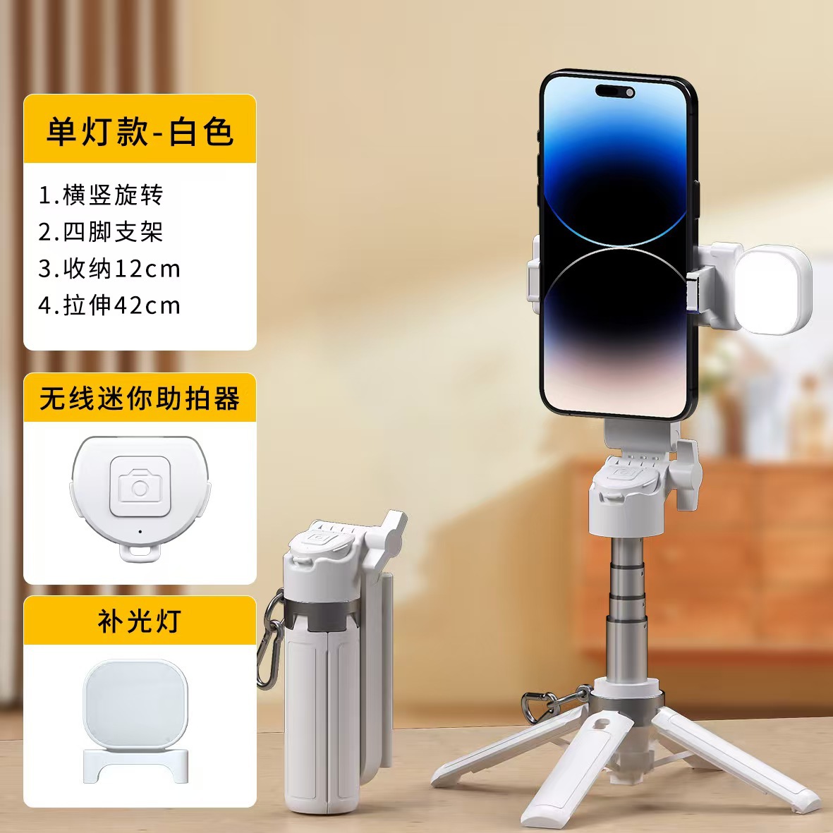 • M1 화이트 (블루투스 리모컨 + 사각 드래곤 뼈대 지지대 + 키링 + 신축봉 + 싱글 뷰티 조명)