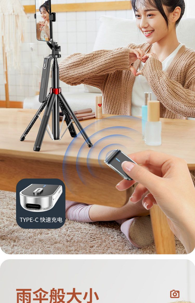 • 1.6m 접이식 손잡이 셀카봉 [단일 소형 조명] - 알루미늄 합금 [일체형 4각 스탠드 + 충전 리모콘]