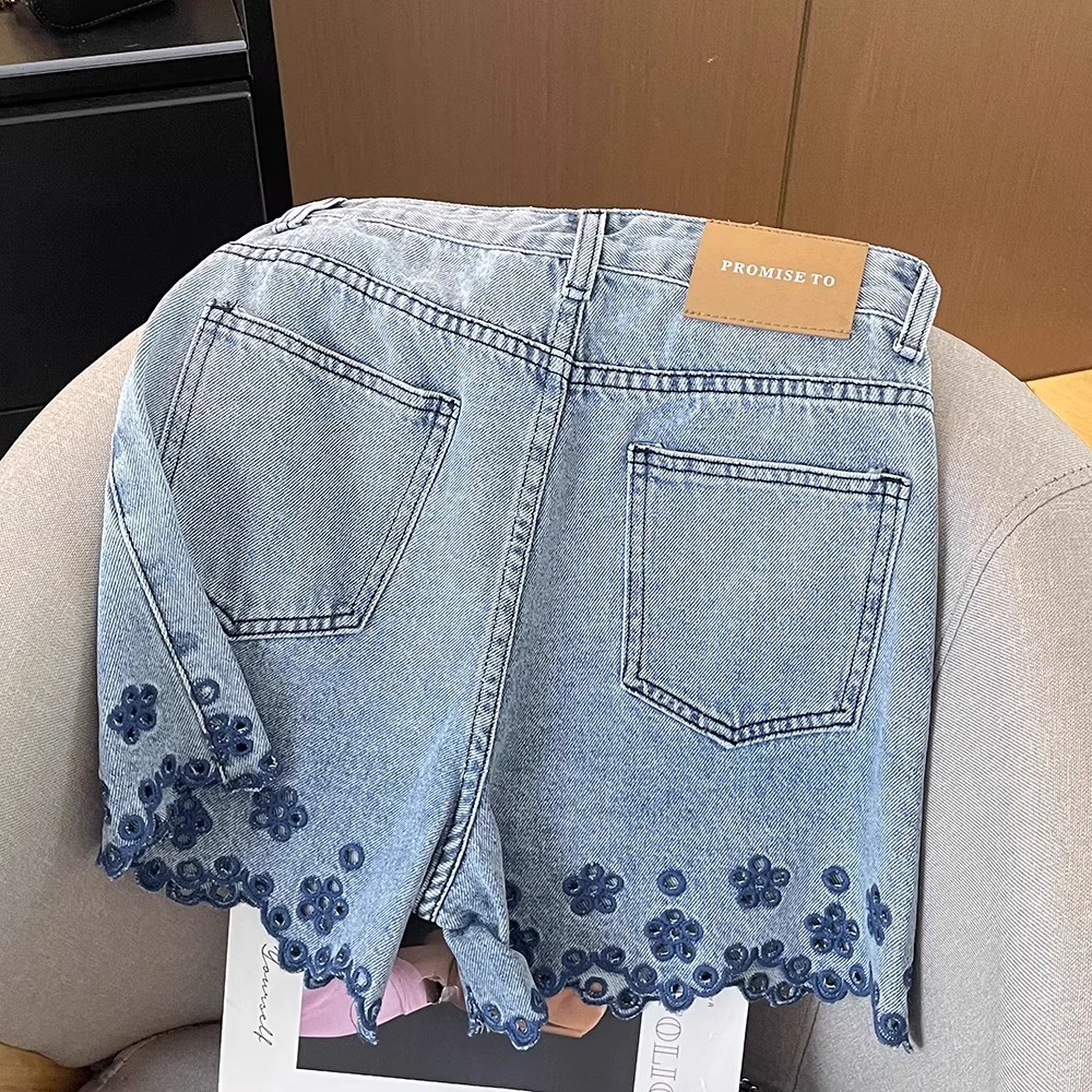 여성을위한 대비 색상 중공 자수 꽃 데님 반바지 여름 새로운 느슨한 스트레이트 바지 하이 웨이스트 a 라인 와이드 레그 핫 팬츠스토어 가기