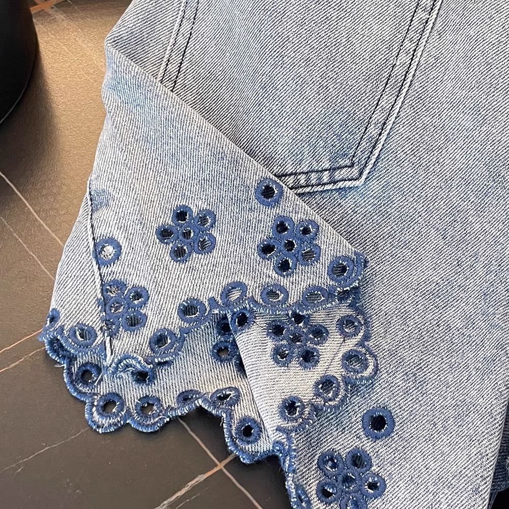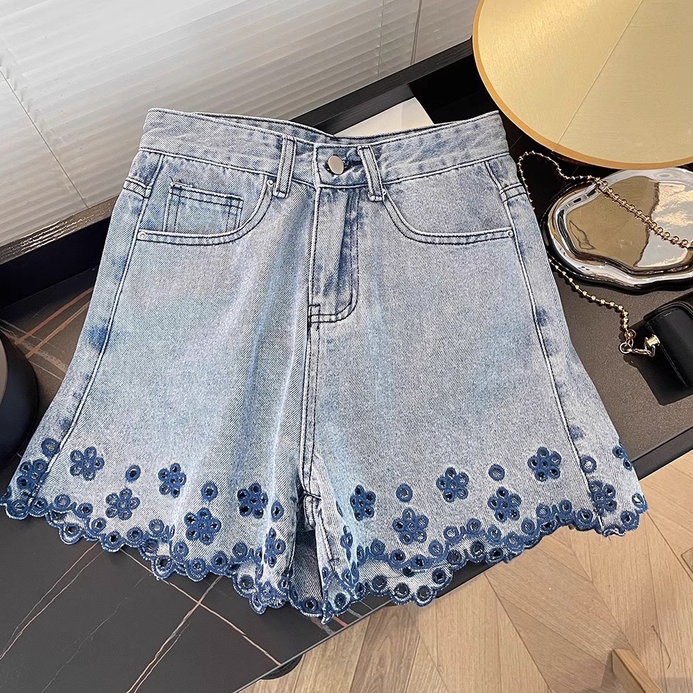 여성을위한 대비 색상 중공 자수 꽃 데님 반바지 여름 새로운 느슨한 스트레이트 바지 하이 웨이스트 a 라인 와이드 레그 핫 팬츠