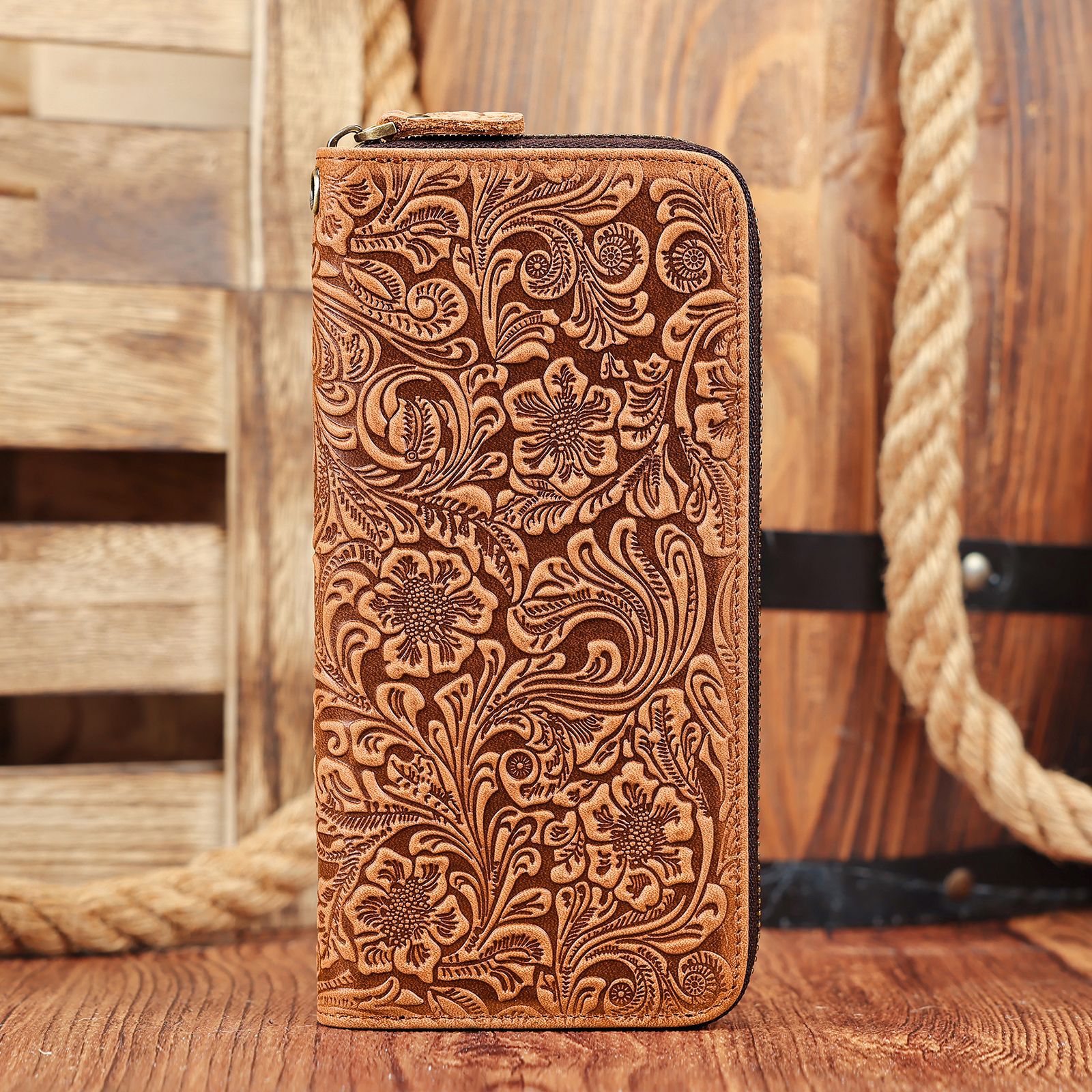 남성과 여성을 위한 Crazy Horse 가죽 긴 캐주얼 지갑, 카드 홀더, 지퍼, 멀티 카드 슬롯 클러치 백, 복고풍 양각 중국 스타일 지갑
