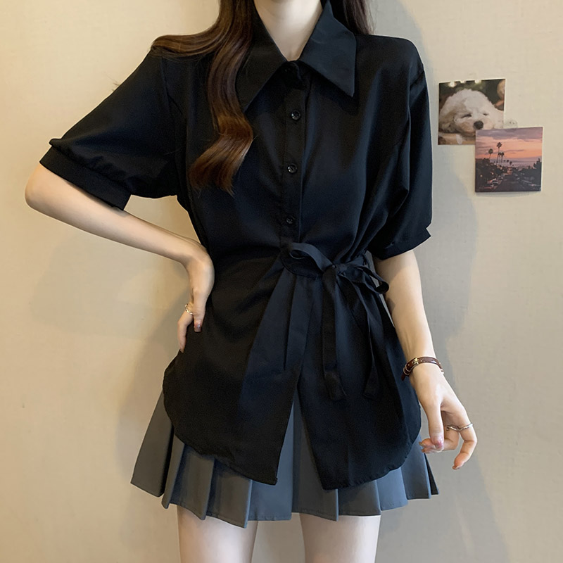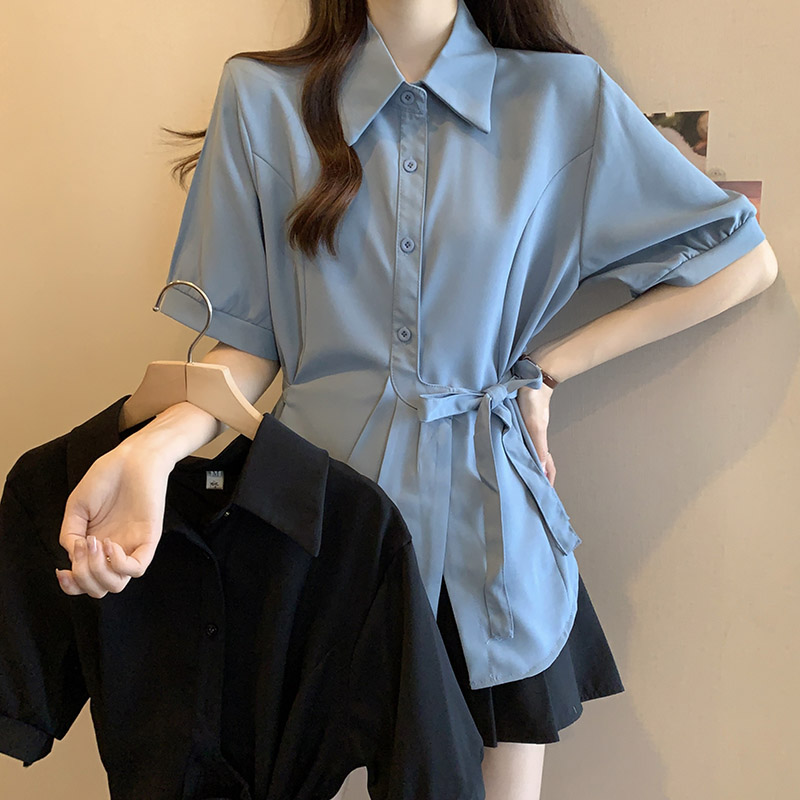 • 블루 [여성 의류 2024 새로운 스타일/여성용 반팔 셔츠 디자인 틈새 짧은 스타일/여성용 서양식 작은 셔츠/자외선 차단 셔츠/셔츠 2024 새로운 스타일 여성용 라이트 럭셔리