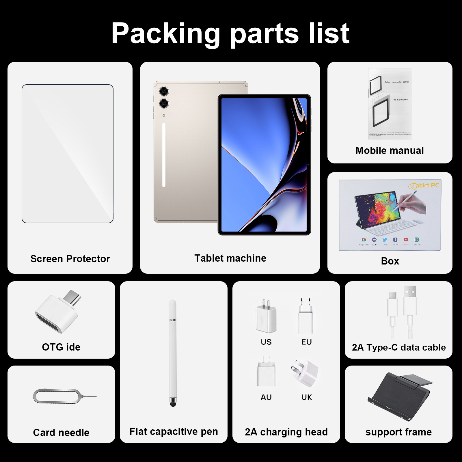 出货标准:平板+卡针+盒子+说明书+2A充头+Type-c数据线+三层保护膜+平板电容笔+OTG转接口