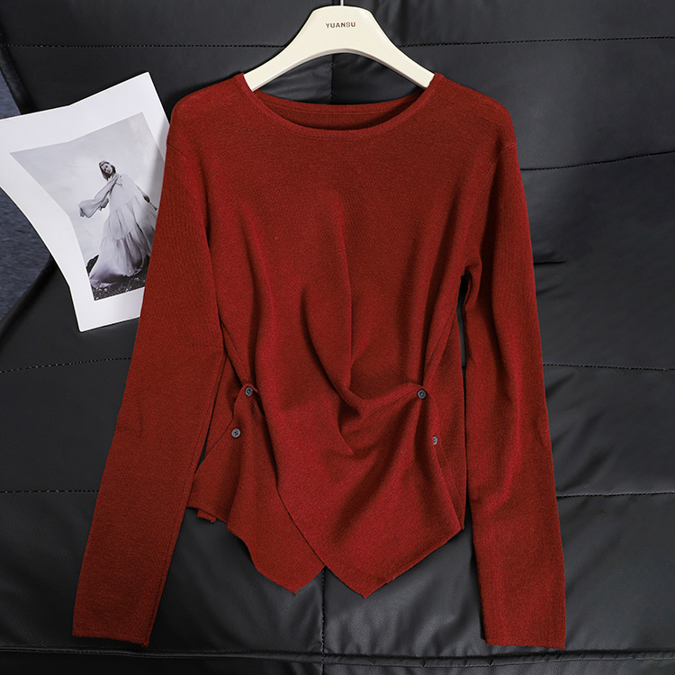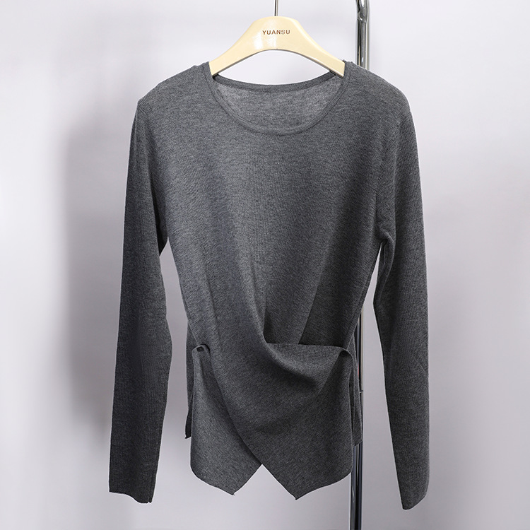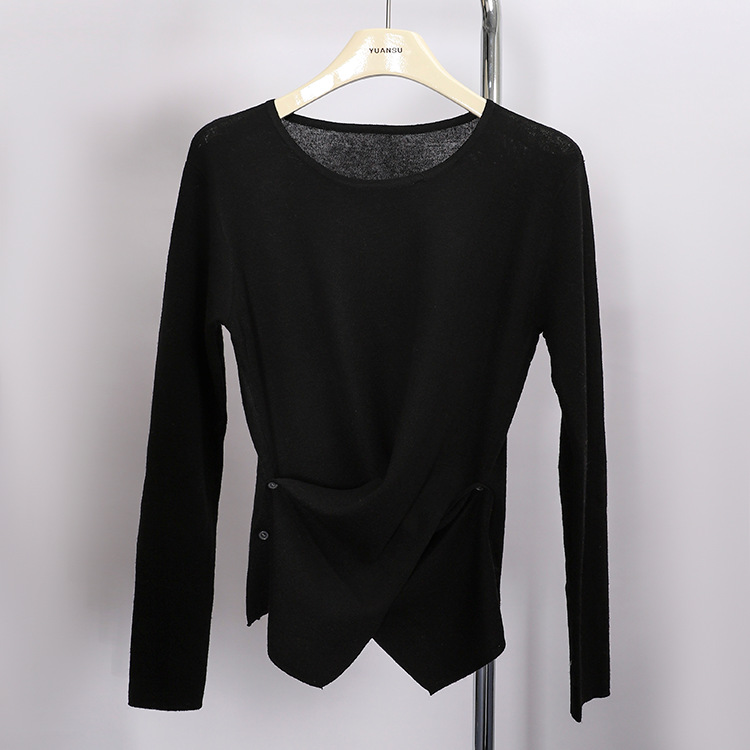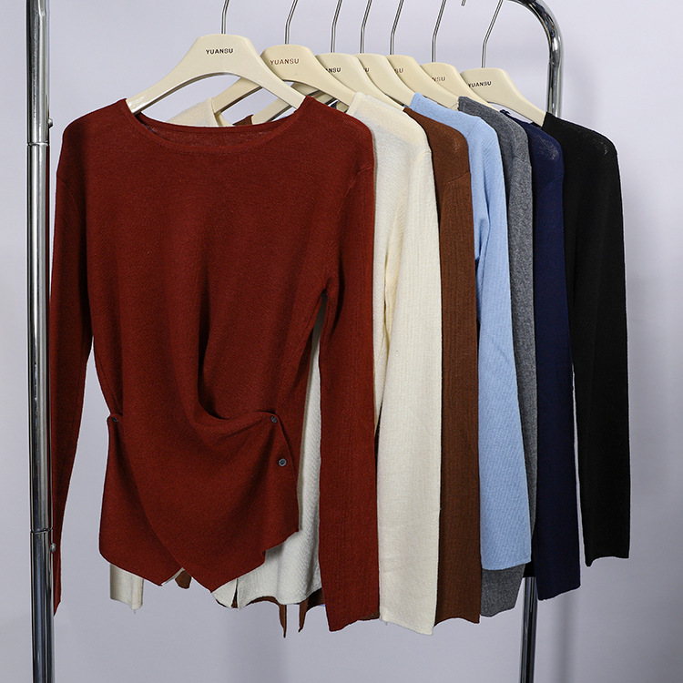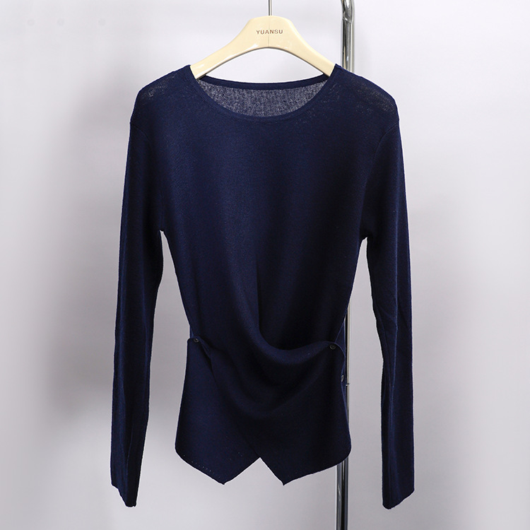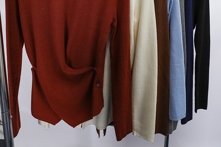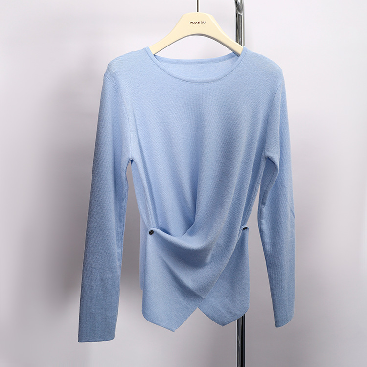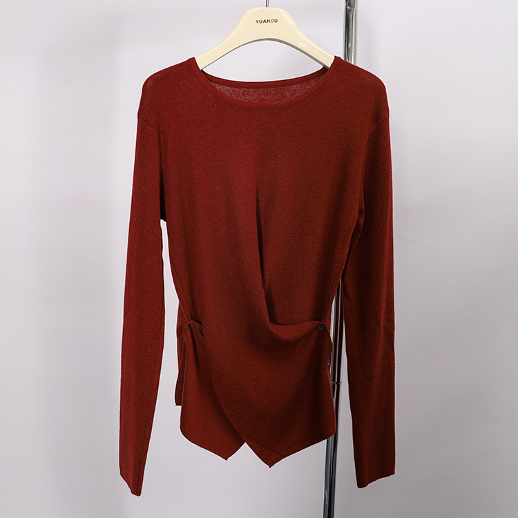 편안하고 부드럽고 패셔너블한 라운드 넥 긴팔 탑, 틈새 디자인, 허리 크로스 버튼 여성용 울 스웨터스토어 가기