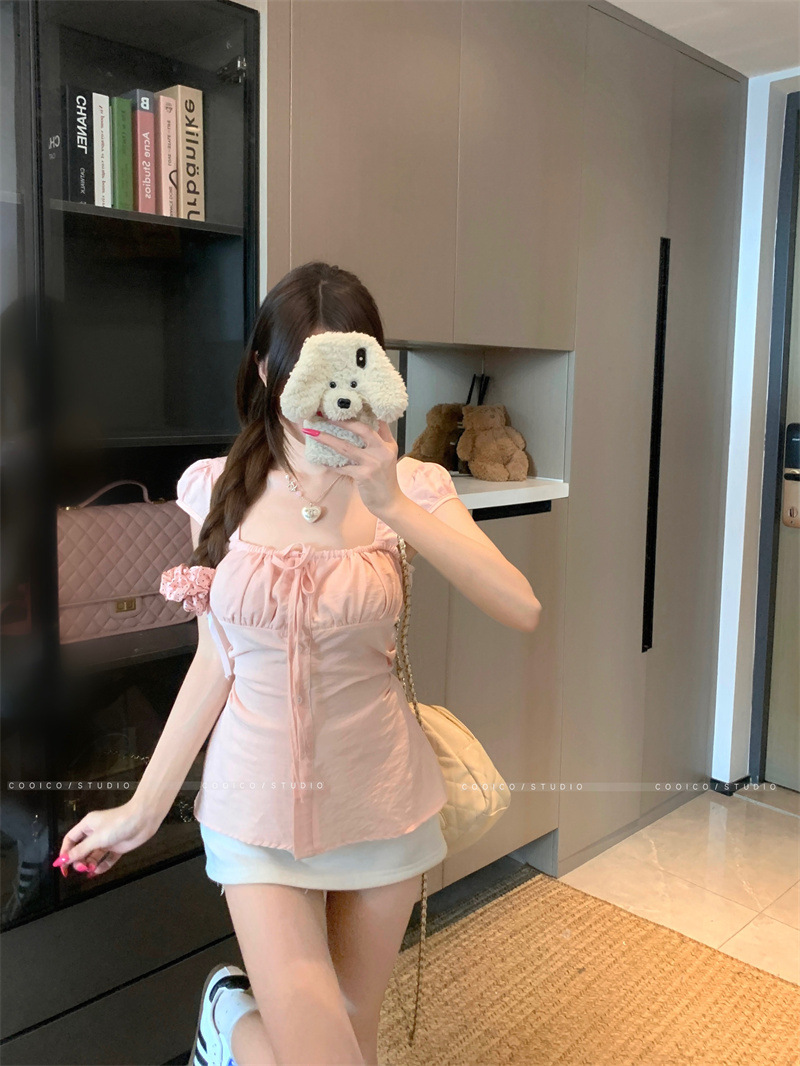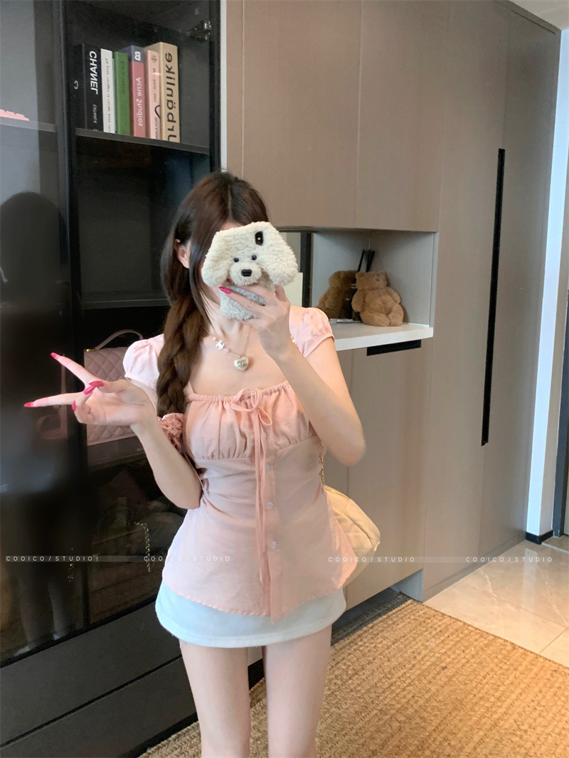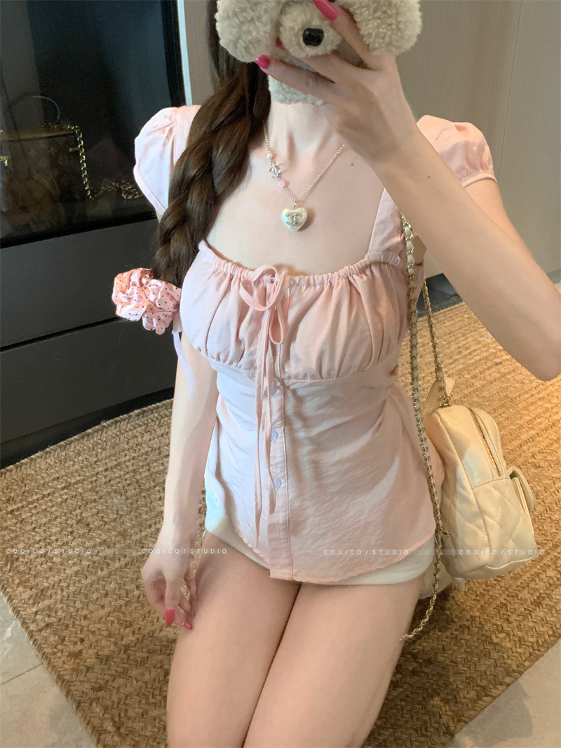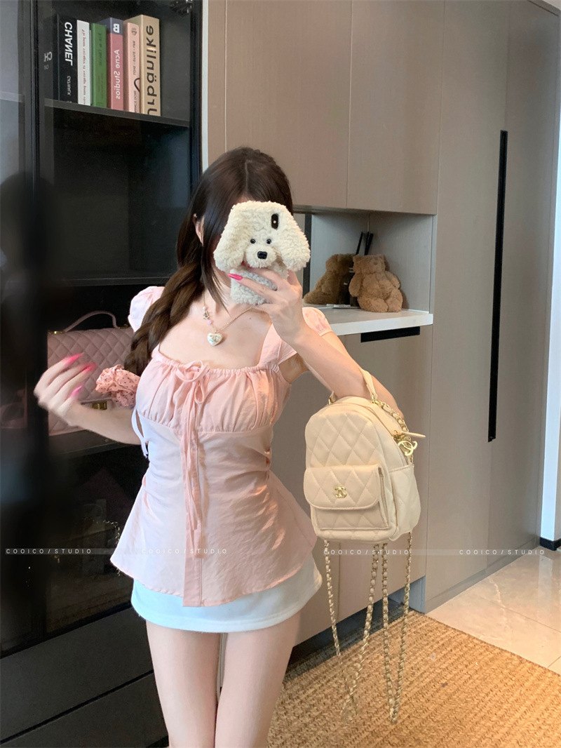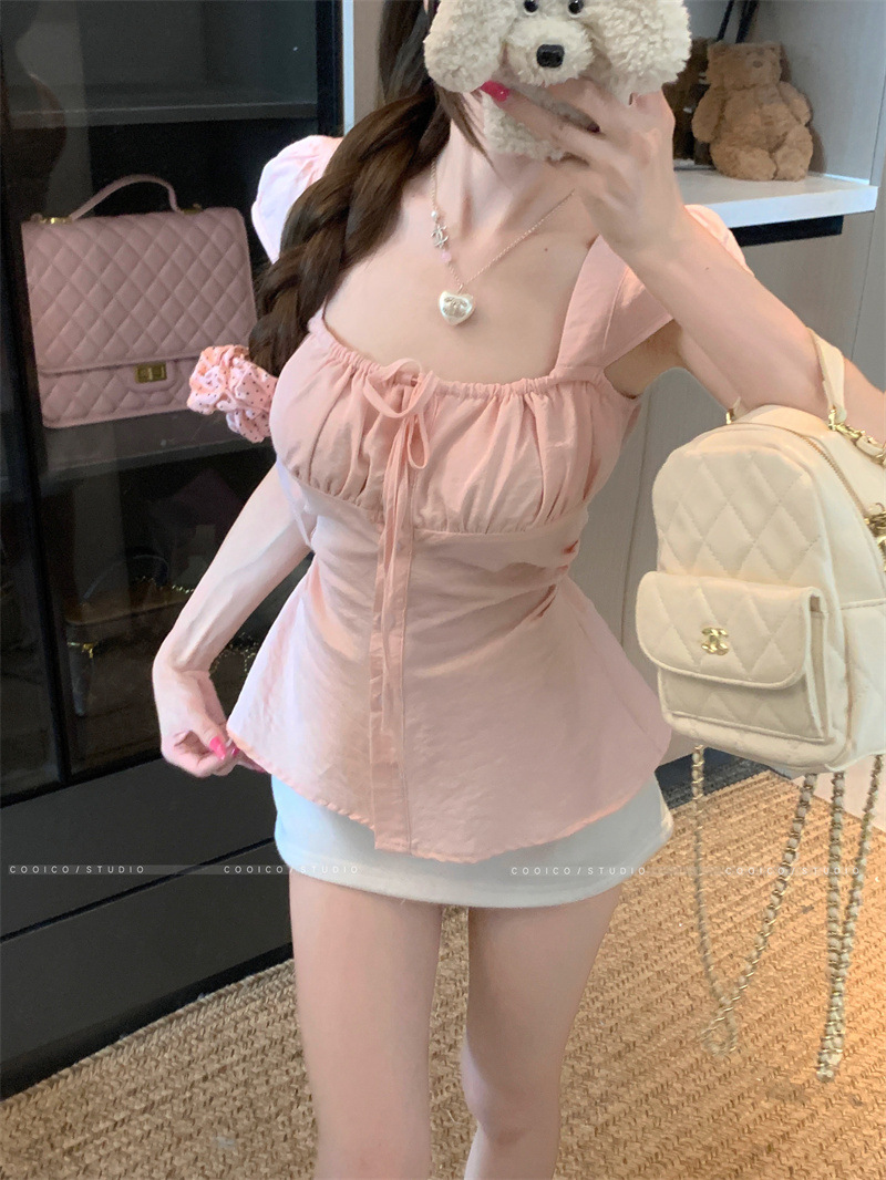 퓨어 러시 스타일 핑크 스퀘어 넥 스트랩 플리츠 셔츠 여성 여름 스위트 핫 걸 니치 시크 웨이스트 슬리밍 탑