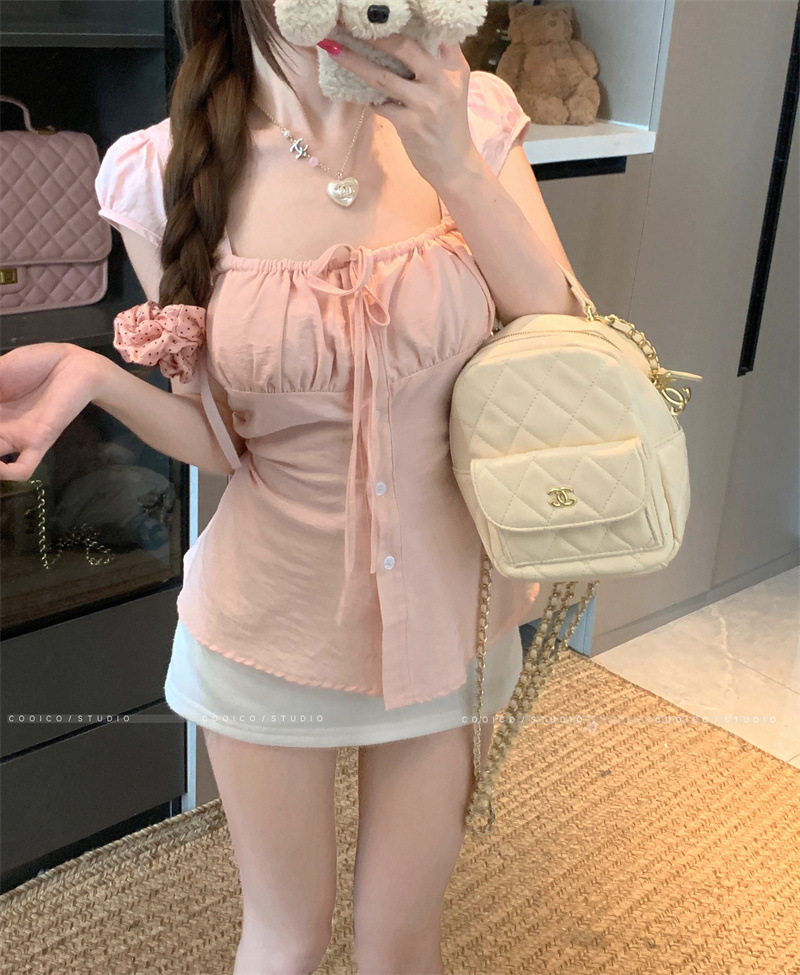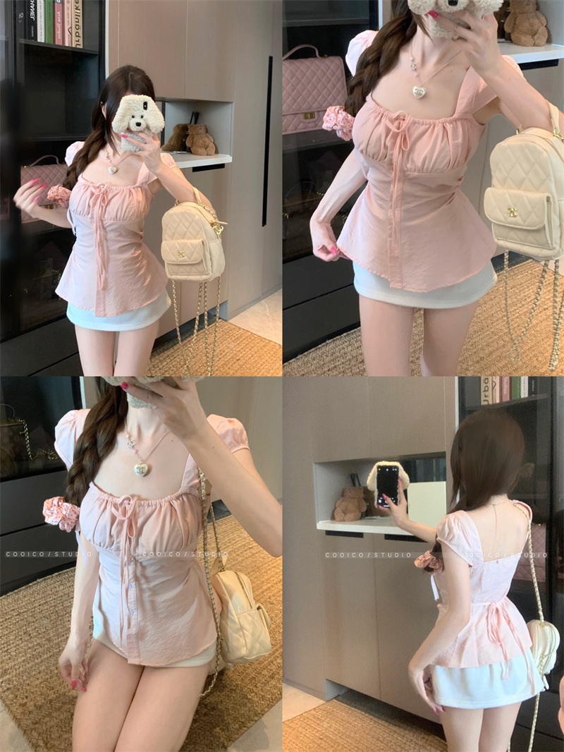 퓨어 러시 스타일 핑크 스퀘어 넥 스트랩 플리츠 셔츠 여성 여름 스위트 핫 걸 니치 시크 웨이스트 슬리밍 탑스토어 가기