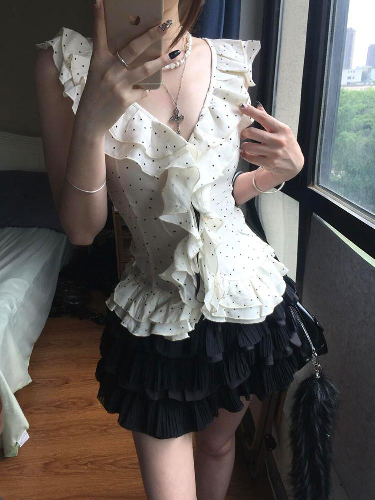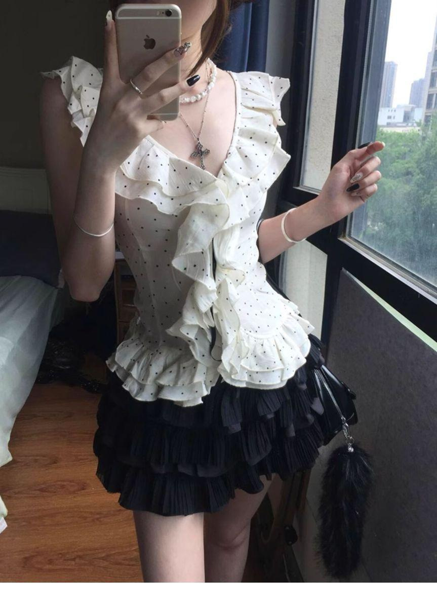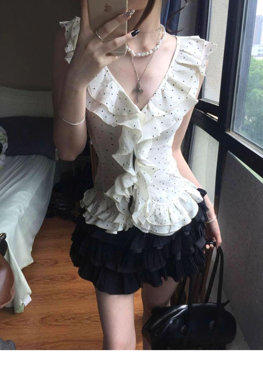 오리지널 패브릭 러플 폴카 도트 v 넥 민소매 쉬폰 셔츠 여성 여름 슬림 허리 스위트 쇼트 탑스토어 가기