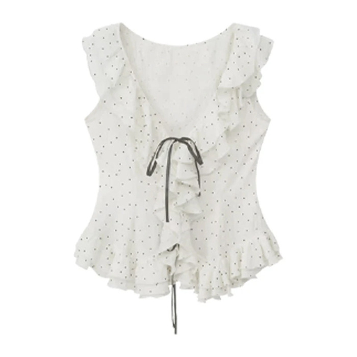 오리지널 패브릭 러플 폴카 도트 v 넥 민소매 쉬폰 셔츠 여성 여름 슬림 허리 스위트 쇼트 탑
