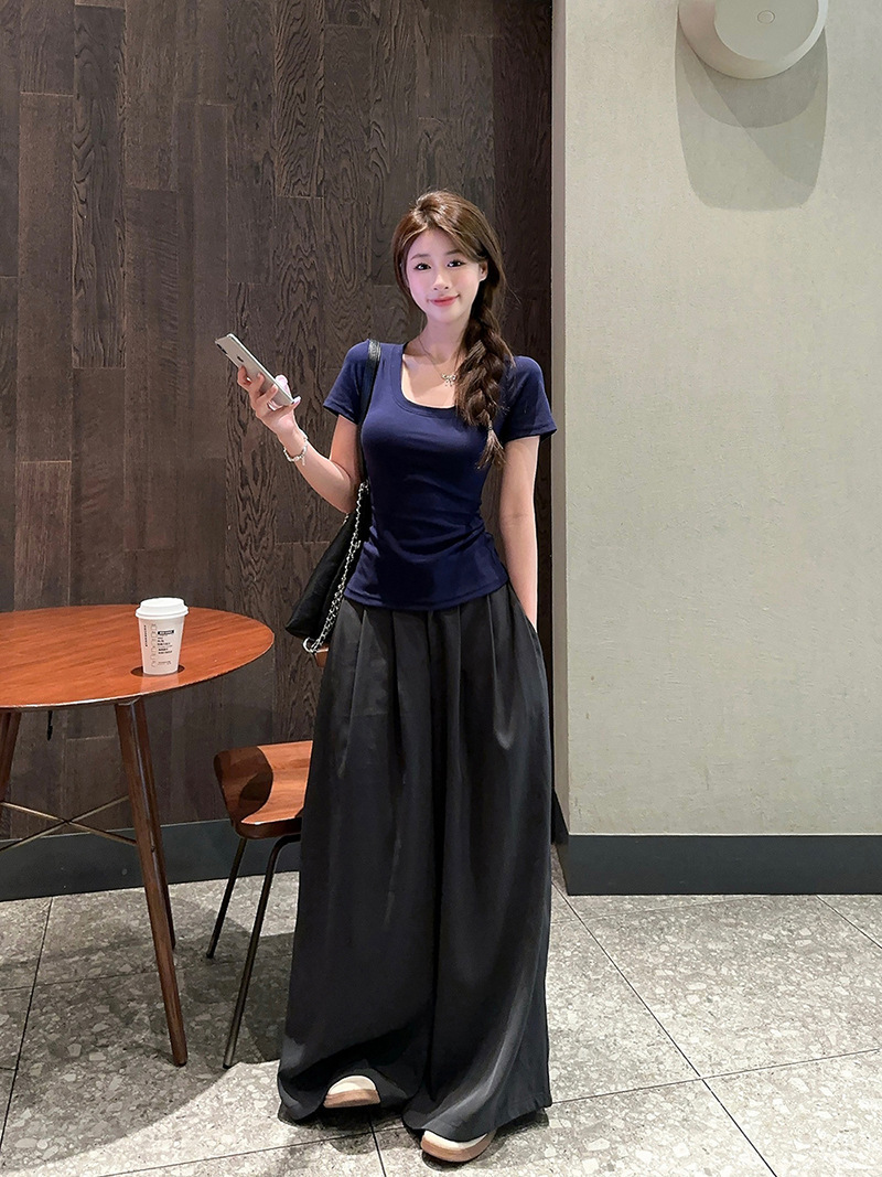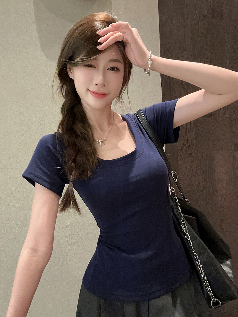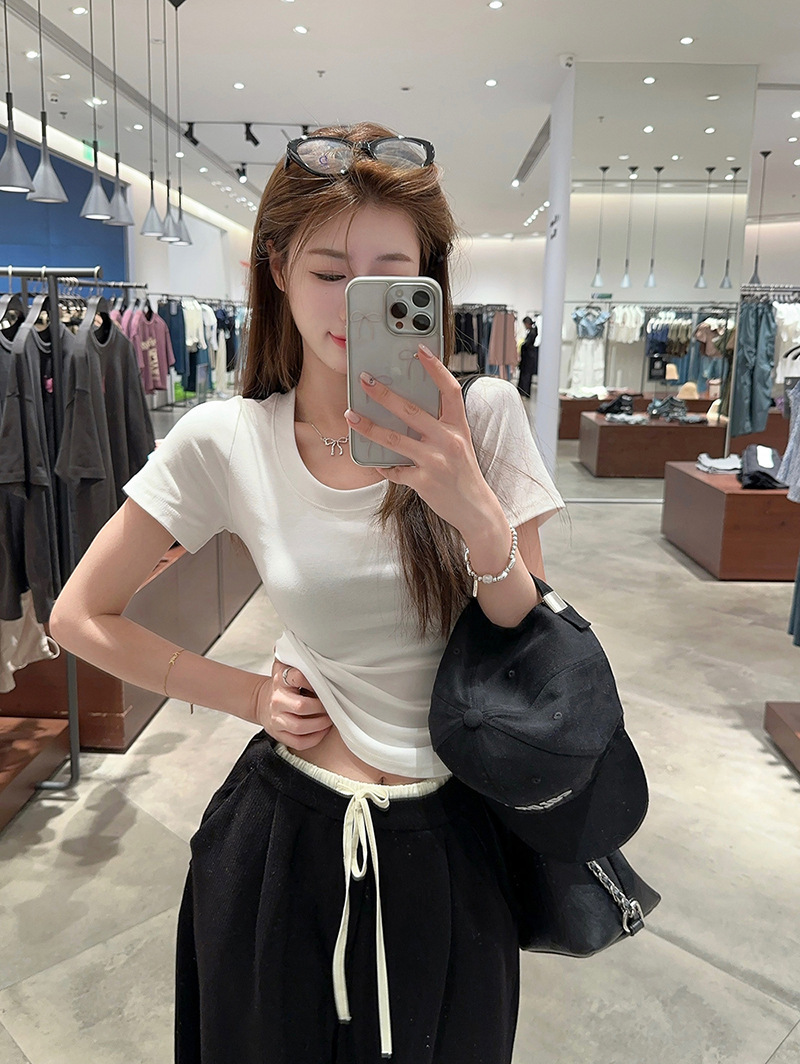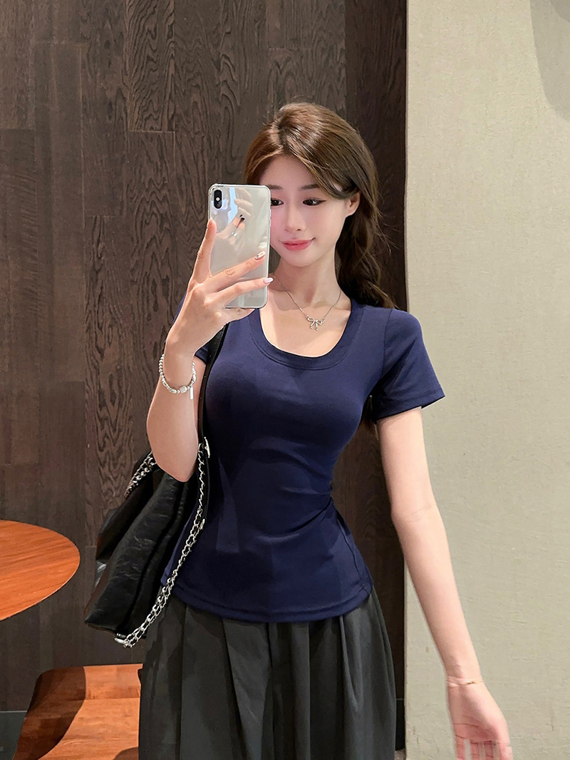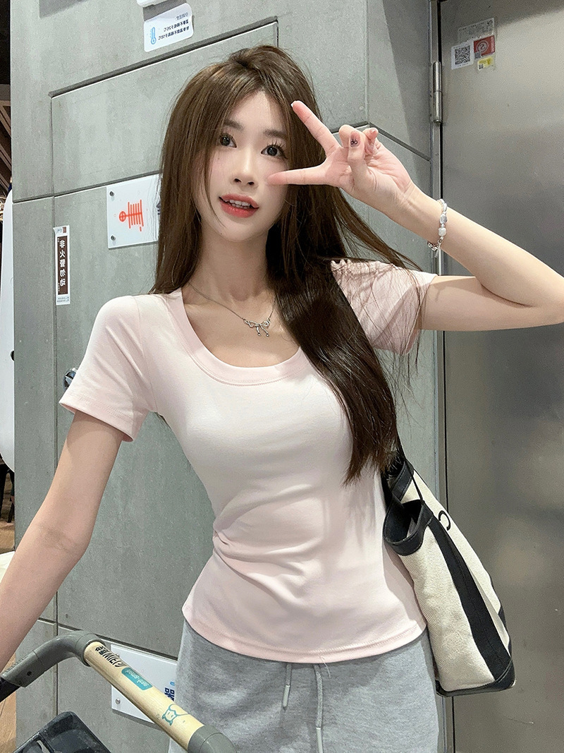 百搭U领正肩短袖T恤女装夏季新款弹力修身显瘦纯色简约基础款上衣