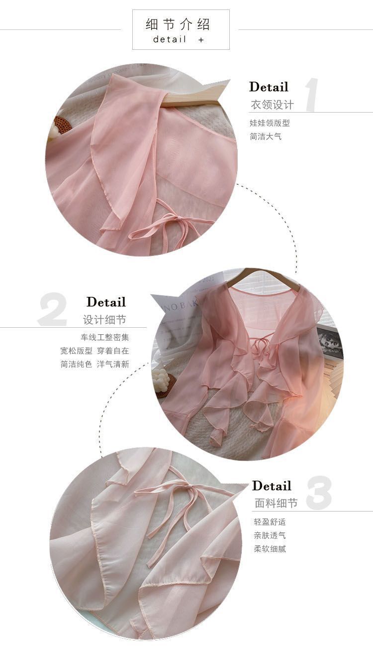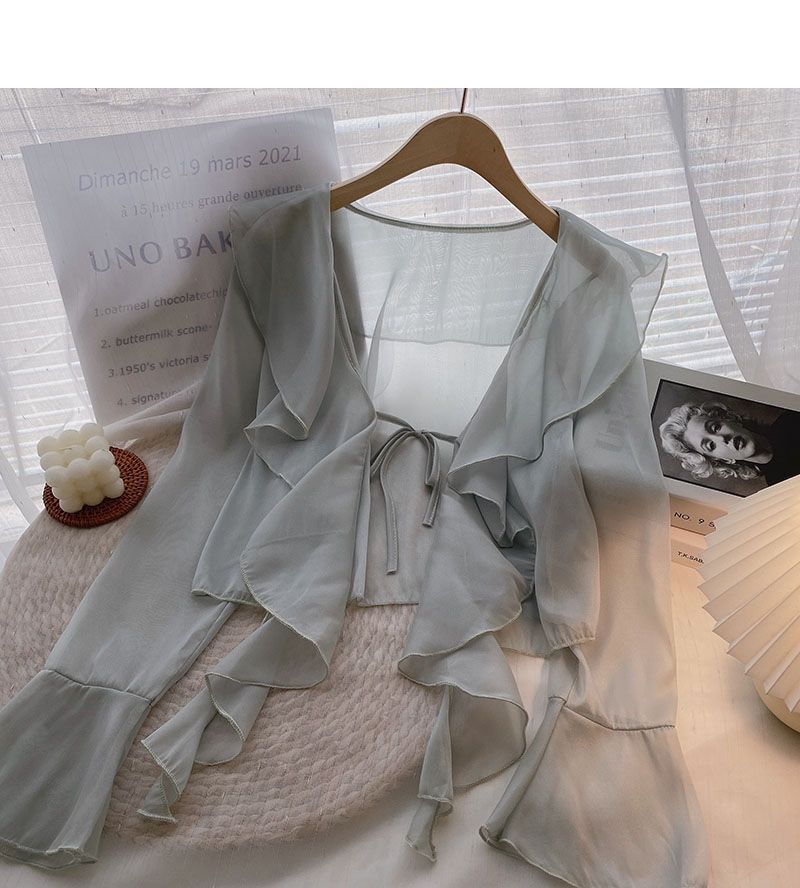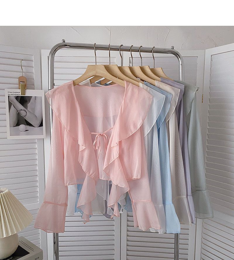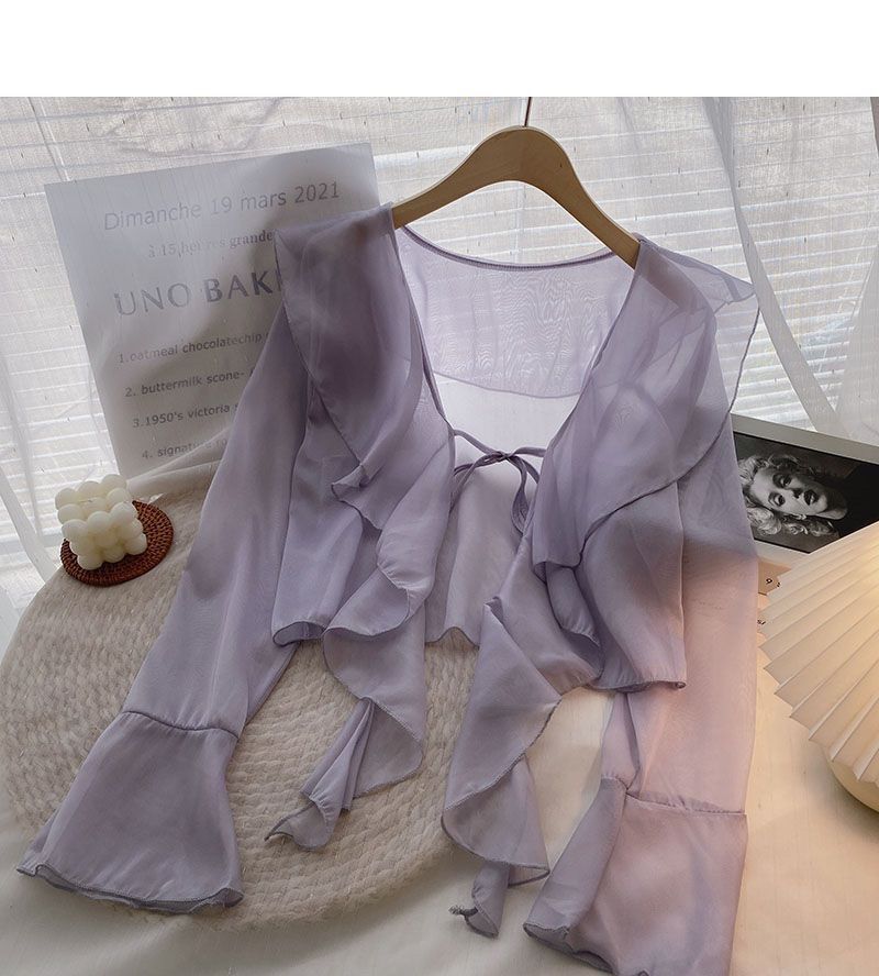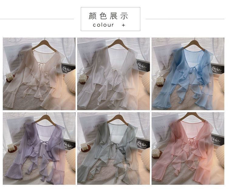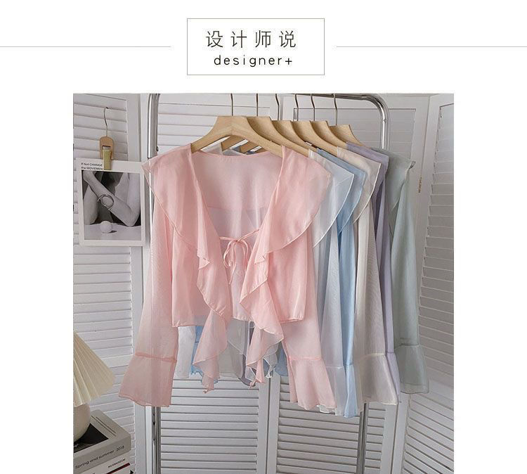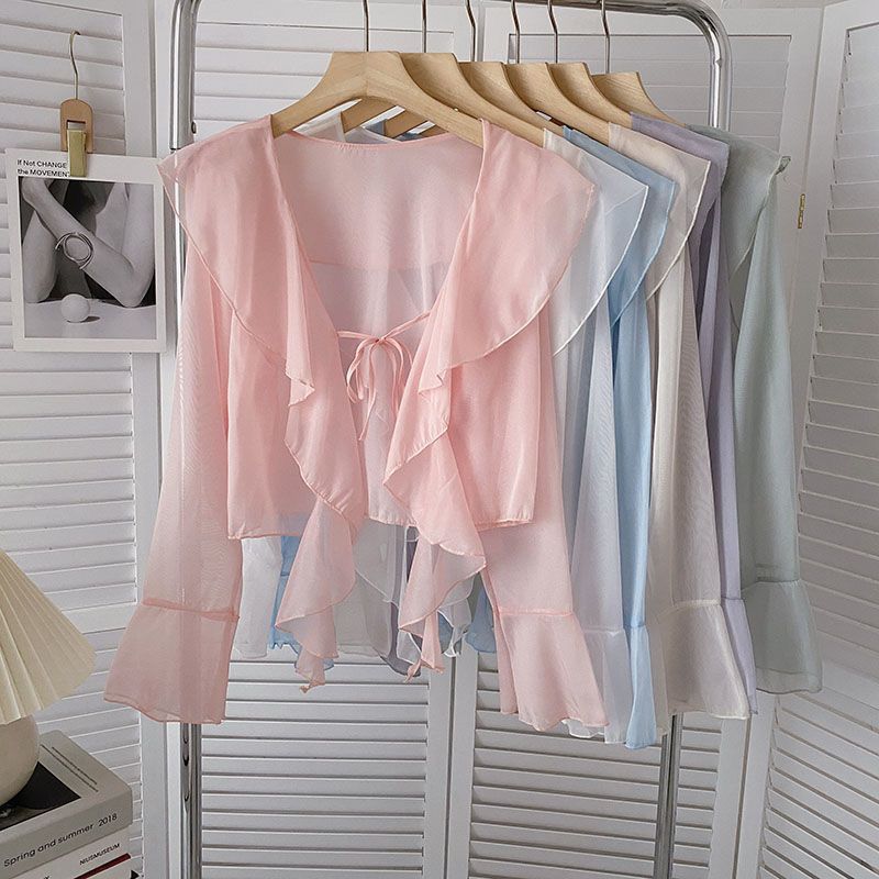 여성용 러플 쉬폰 자외선 차단 의류, 긴팔 레이스 업 벨 슬리브 베이비돌 셔츠, 여성용 여름 아우터, 에어컨 가디건, 트렌디스토어 가기