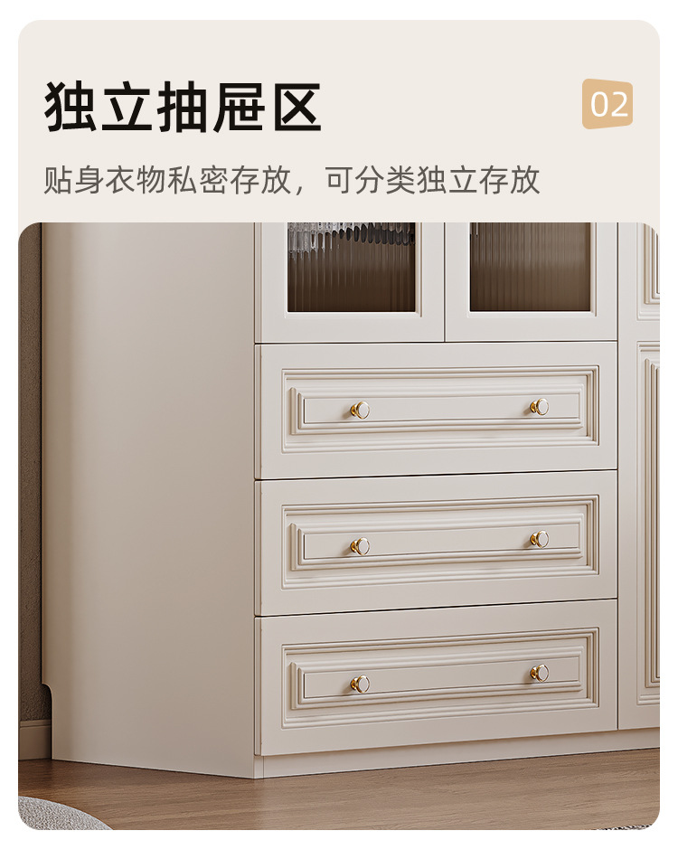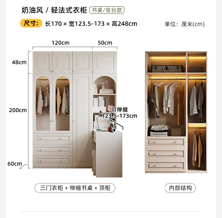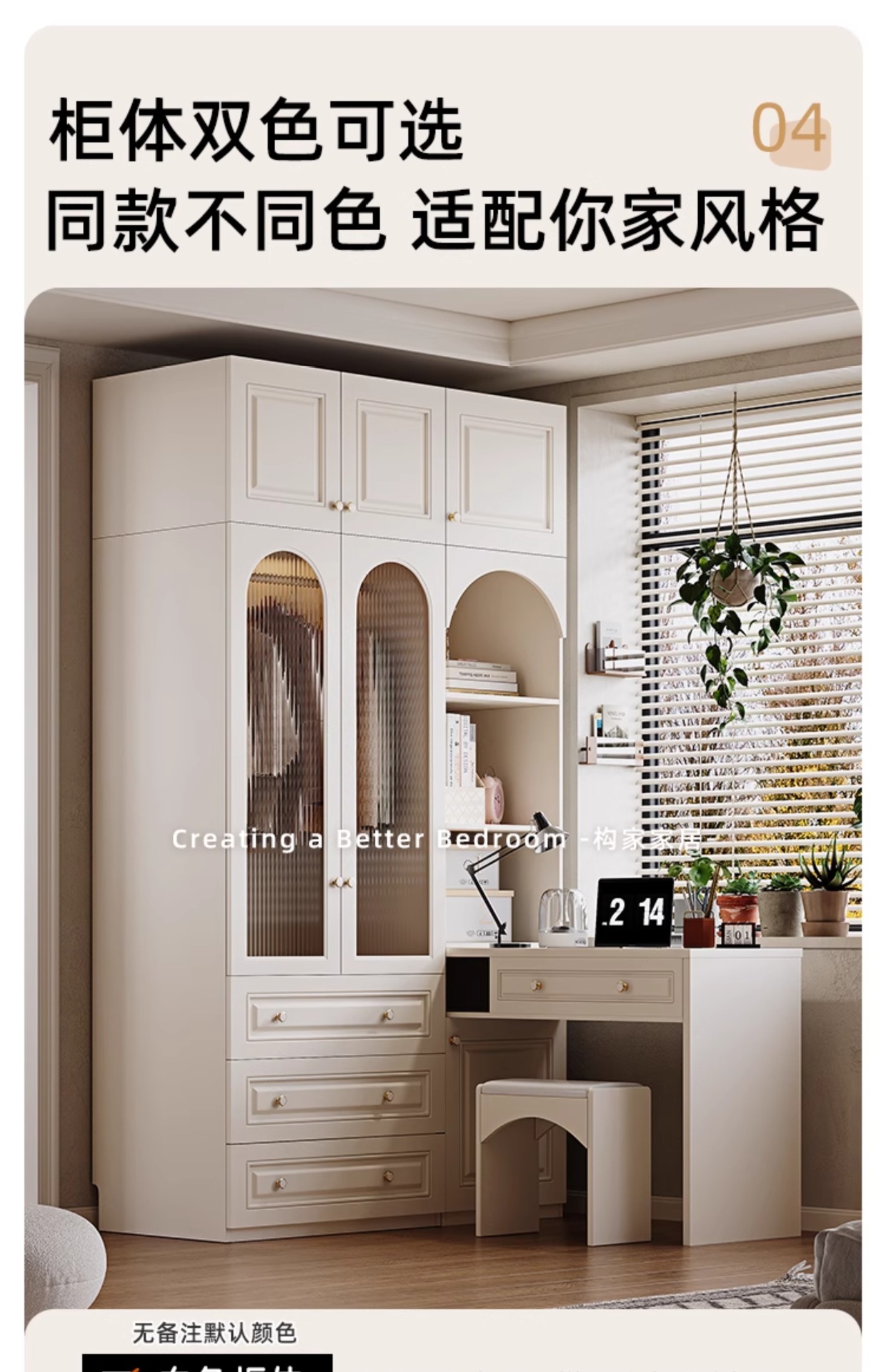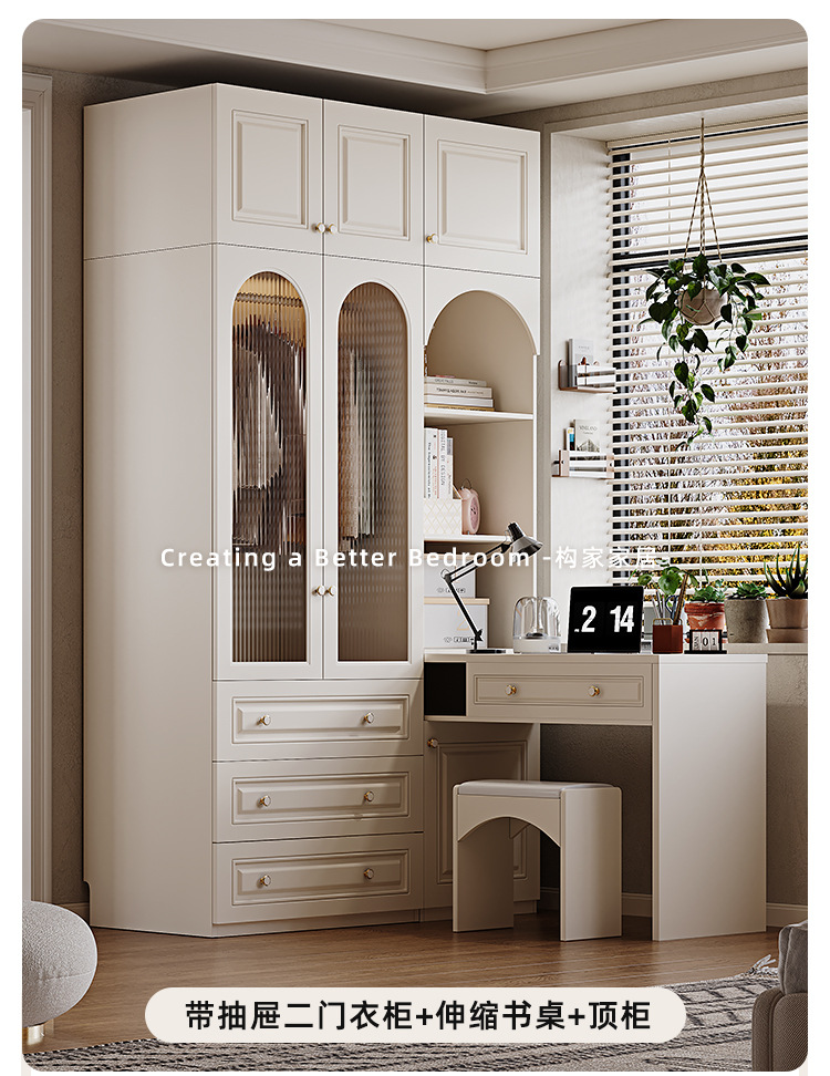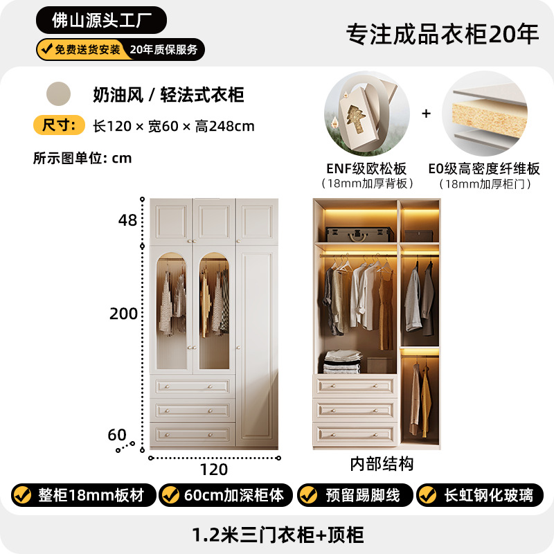 • 유리 모델/120CM 3도어 옷장 + 상단 캐비닛 업그레이드 18MM 두께 플레이트/크림 화이트/60CM 측면 너비
