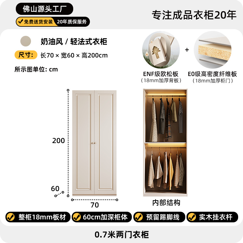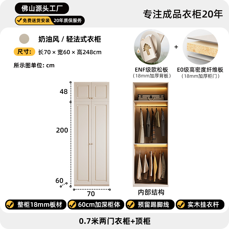 • 70CM 2도어 옷장 + 상단 캐비닛 업그레이드 18MM 두께의 플레이트/크림 화이트/측면 너비 60CM