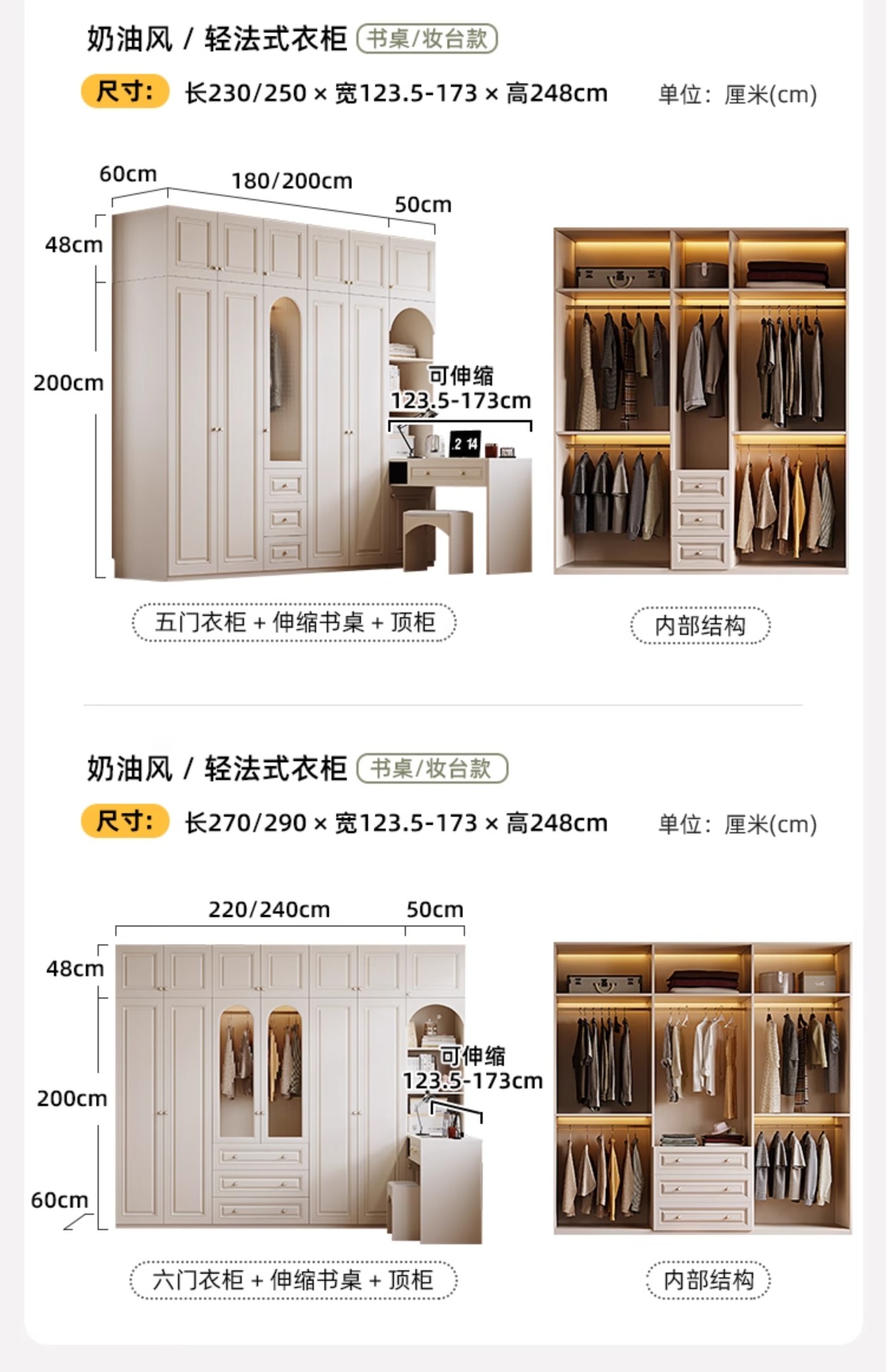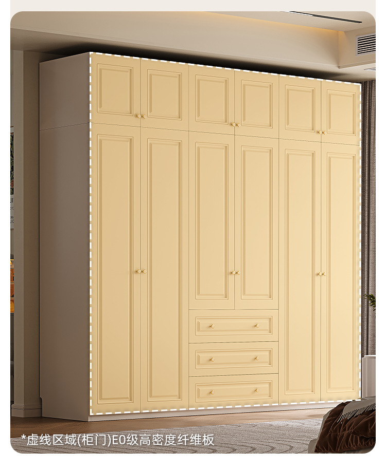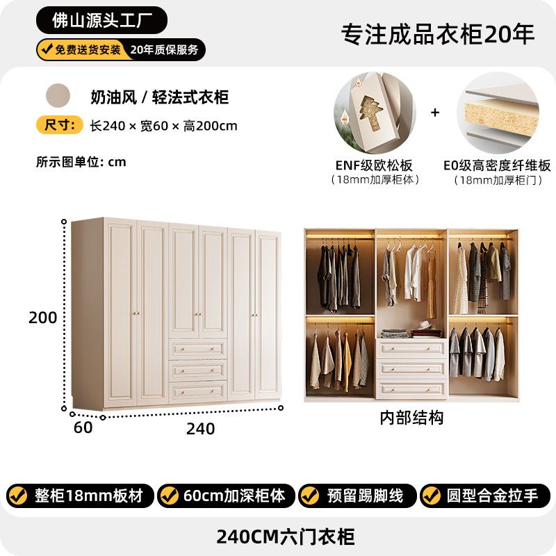 • 240CM 6도어 옷장 + 상단 캐비닛 업그레이드 18MM 두께의 플레이트/크림 화이트/측면 너비 60CM