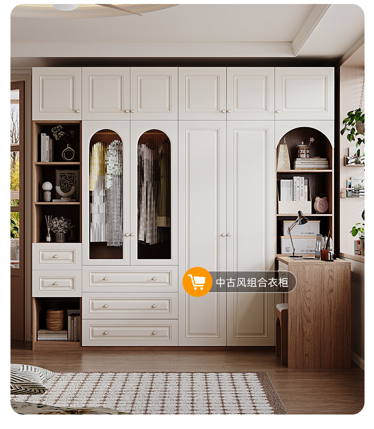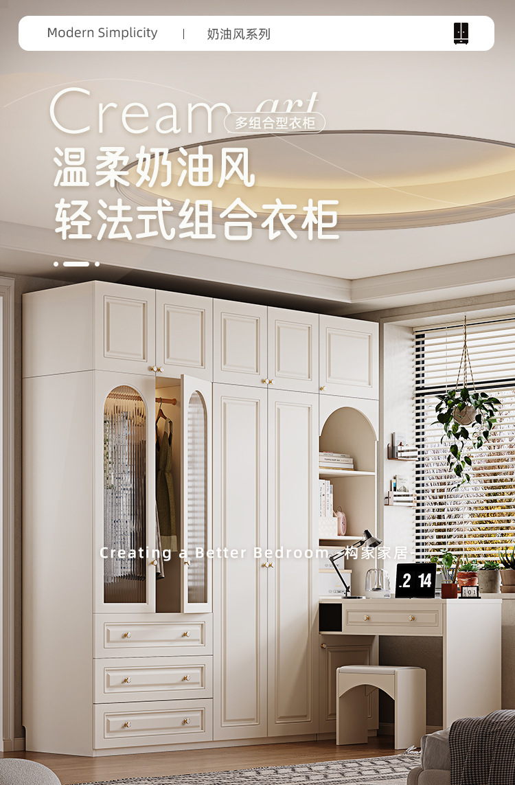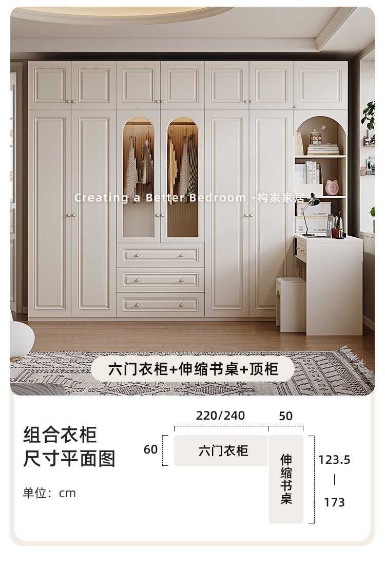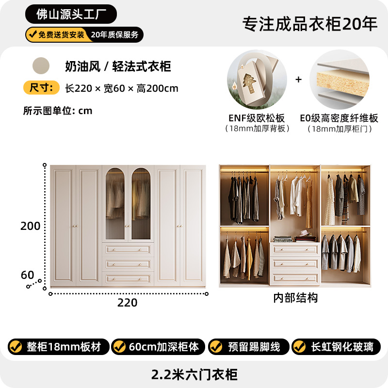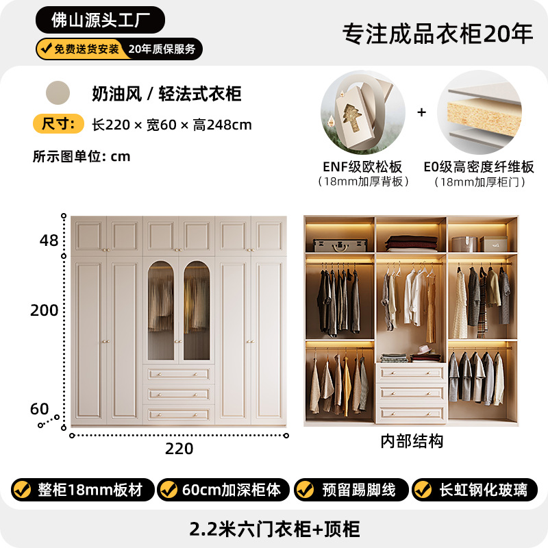 • 유리 모델/220CM 6도어 옷장 + 상단 캐비닛 업그레이드 18MM 두께 플레이트/크림 화이트/60CM 측면 너비