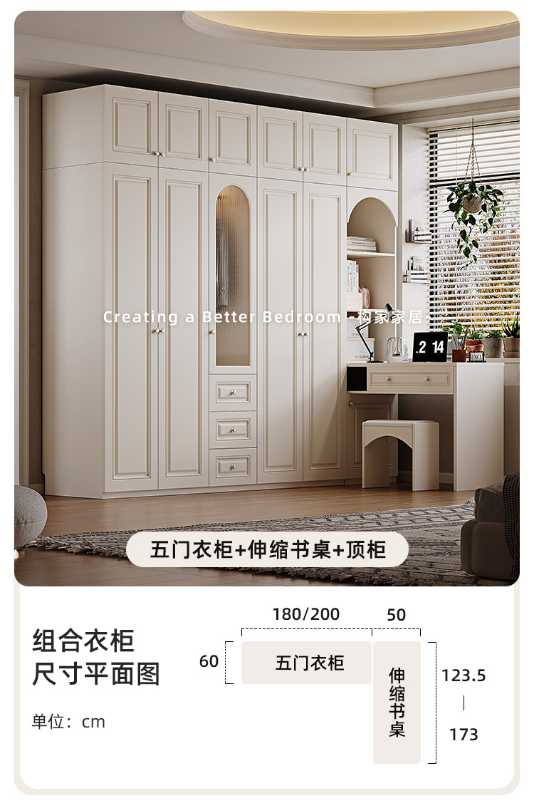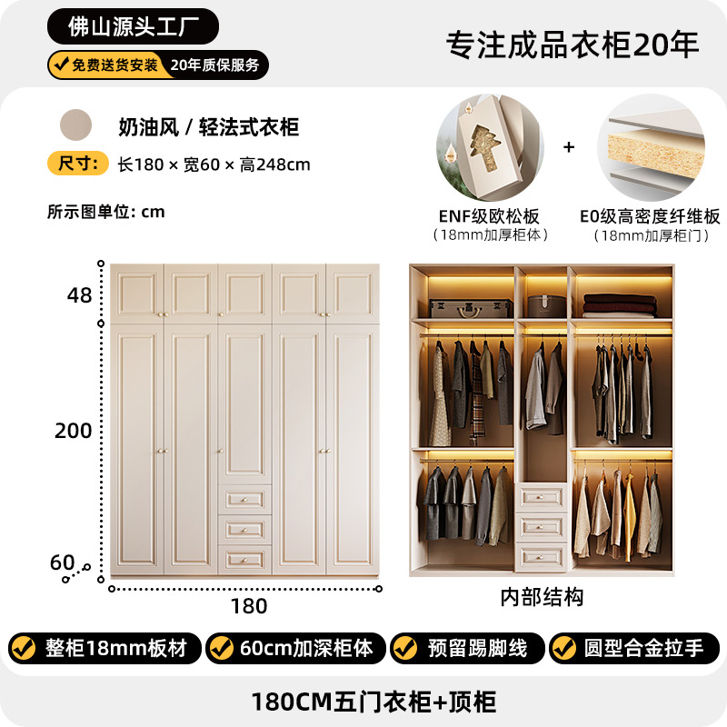 • 유리 모델/180CM 5도어 옷장 + 상단 캐비닛 업그레이드 18MM 두께의 플레이트/크림 화이트/60CM 측면 너비
