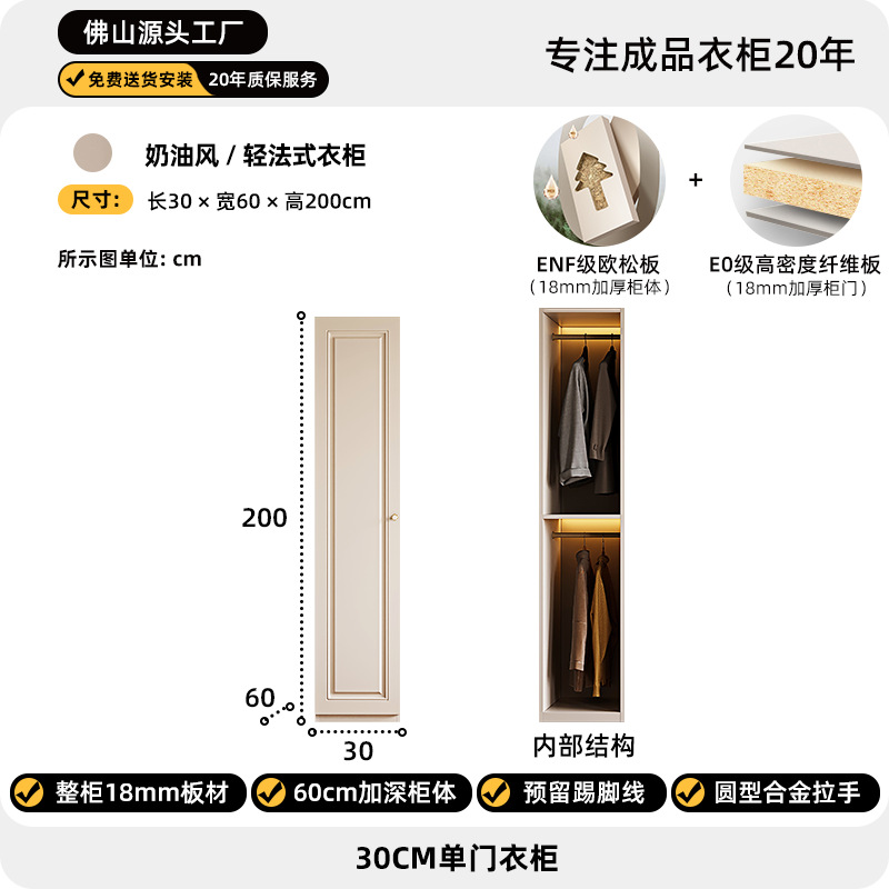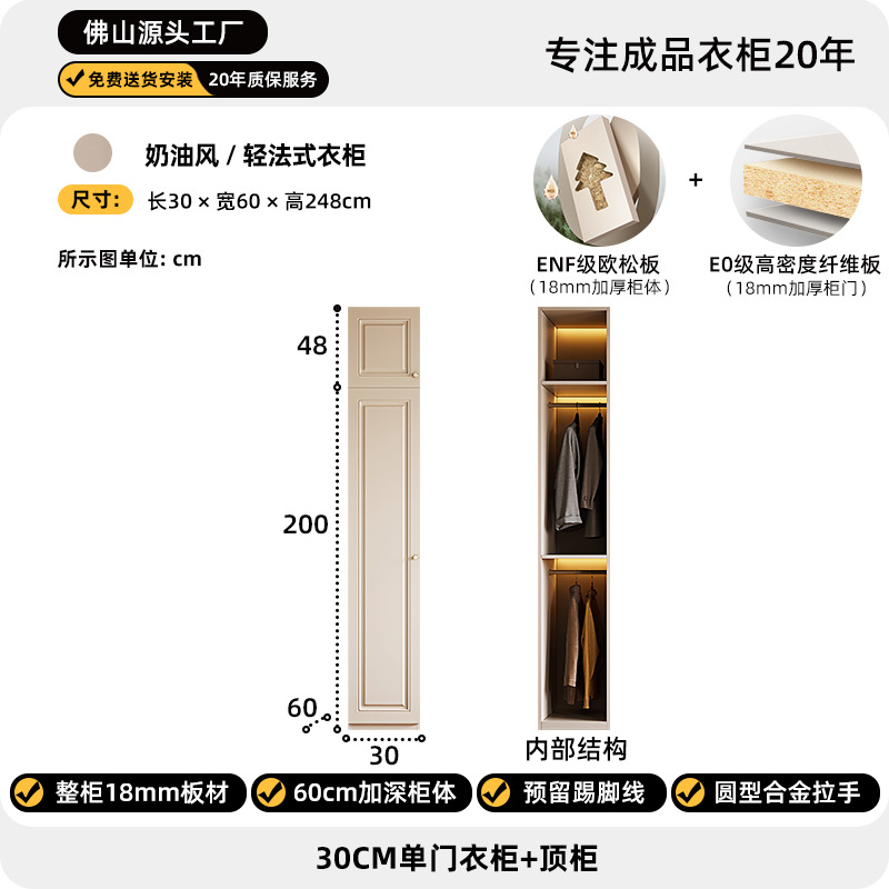 • 30CM 단일 도어 옷장 + 상단 캐비닛 업그레이드 18MM 두께의 플레이트/크림 화이트/60CM 측면 너비