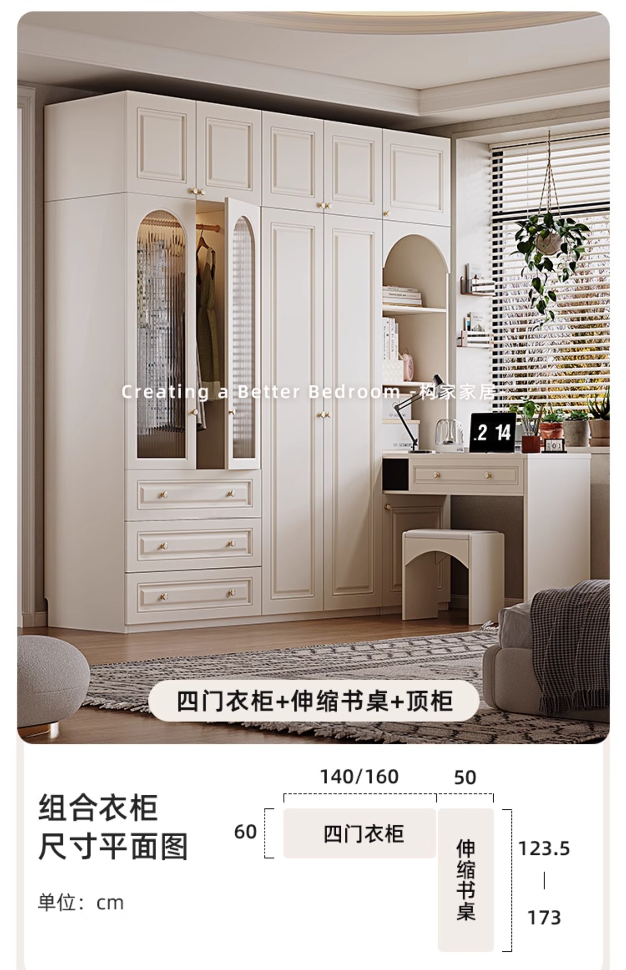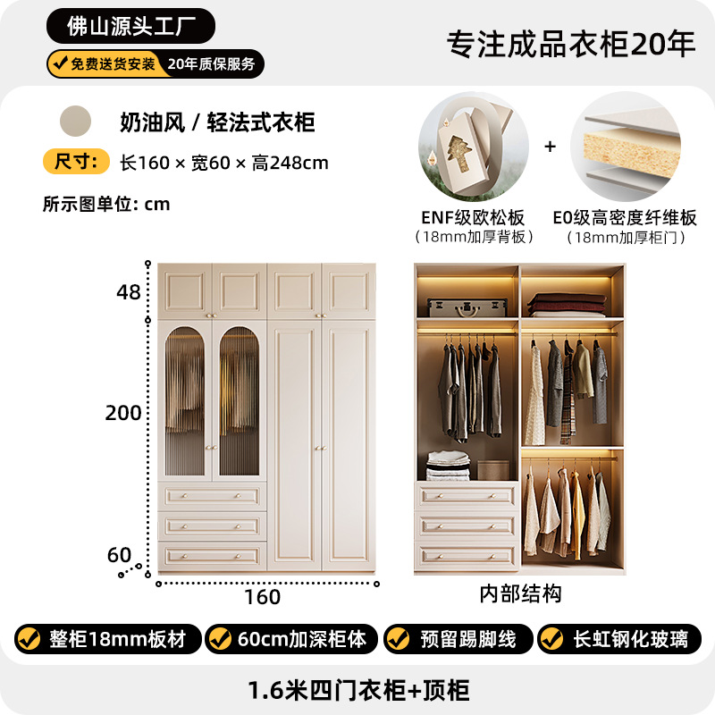 • 유리 모델/160CM 4도어 옷장 + 상단 캐비닛 업그레이드 18MM 두께 플레이트/크림 화이트/60CM 측면 너비
