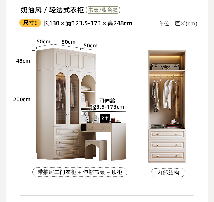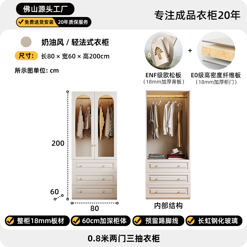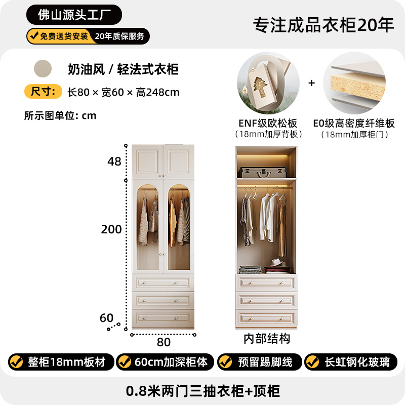 • 유리 모델/80CM 2도어 옷장 + 상단 캐비닛 업그레이드 18MM 두께의 플레이트/크림 화이트/60CM 측면 너비