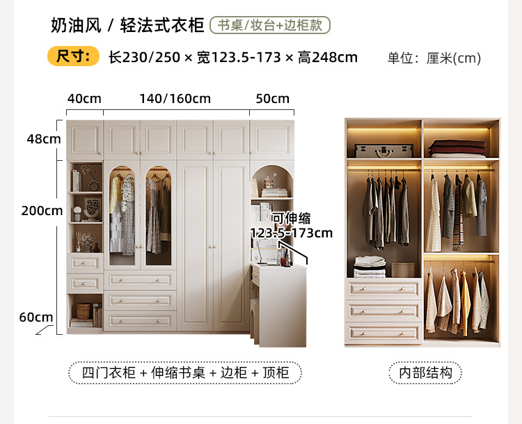 • 160CM 4도어 옷장 + 상단 캐비닛 업그레이드 18MM 두께의 플레이트/크림 화이트/60CM 측면 너비