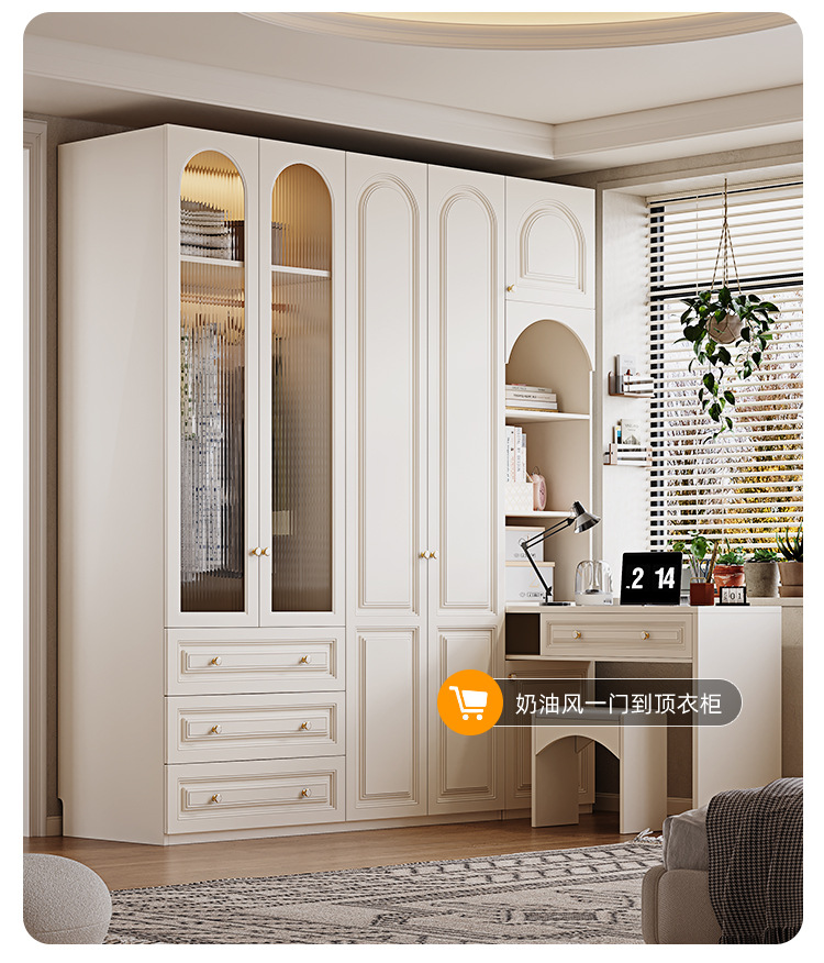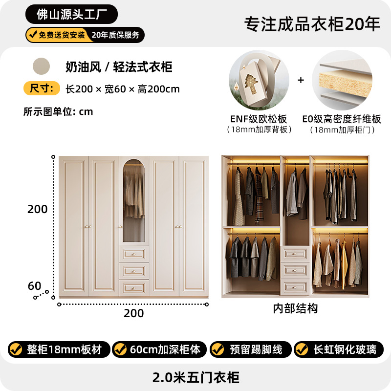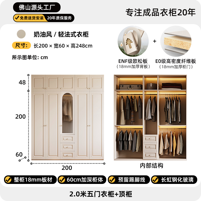 • 유리 모델/200CM 5도어 옷장 + 상단 캐비닛 업그레이드 18MM 두께 플레이트/크림 화이트/60CM 측면 너비
