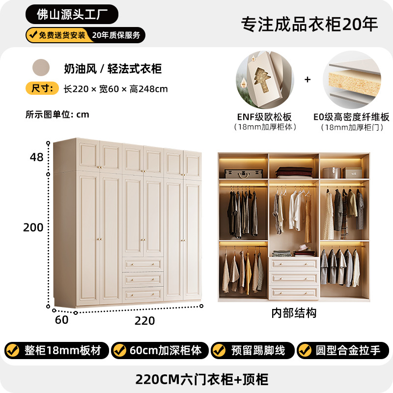 • 220CM 6도어 옷장 + 상단 캐비닛 업그레이드 18MM 두께의 플레이트/크림 화이트/60CM 측면 너비