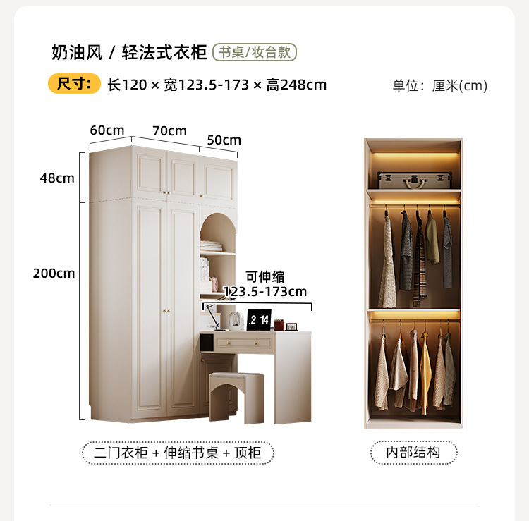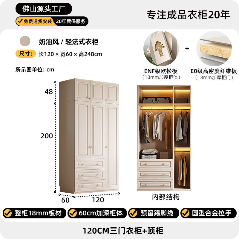 • 120CM 3도어 옷장 + 상단 캐비닛 업그레이드 18MM 두께의 플레이트/크림 화이트/60CM 측면 너비