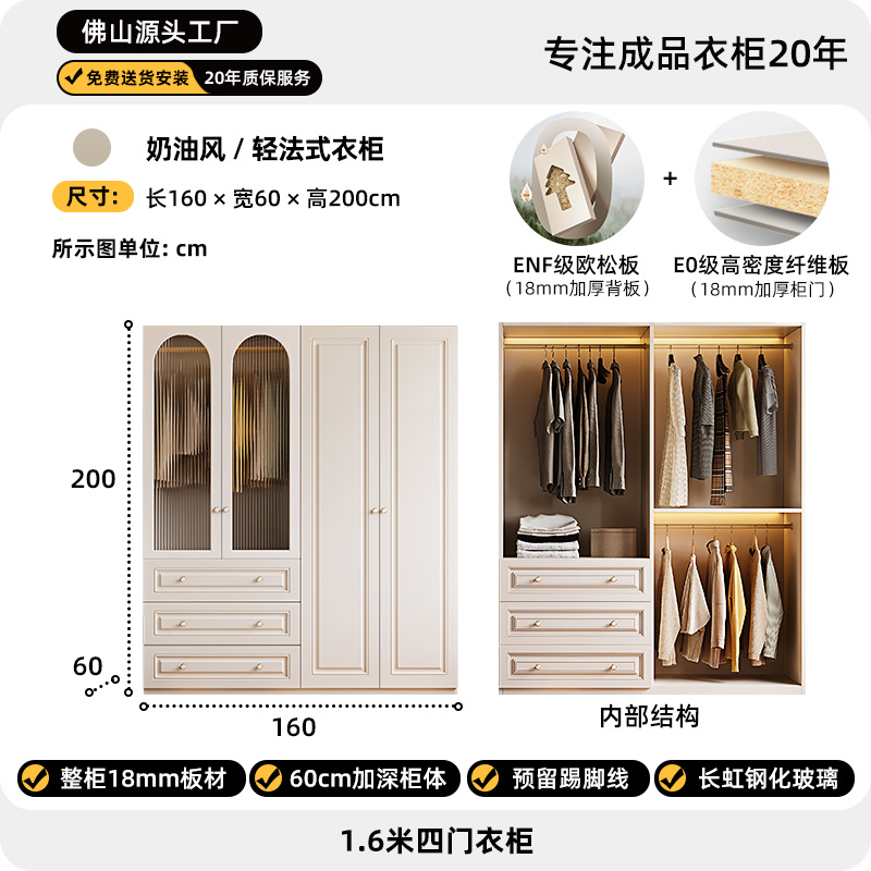 • 유리 모델/160CM 4도어 옷장 업그레이드 18MM 두께의 플레이트/크림 화이트/60CM 측면 너비