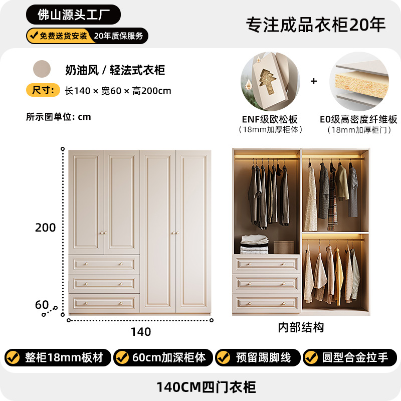 • 140CM 4도어 옷장 업그레이드 18MM 두께의 보드/크림 화이트/측면 너비 60CM
