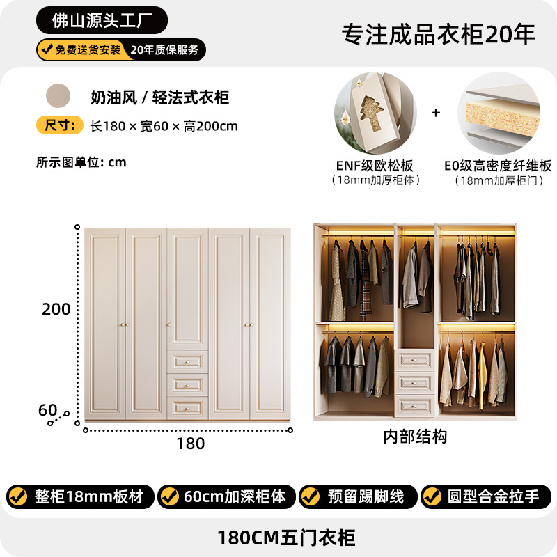 • 180CM 5도어 옷장 업그레이드 18MM 두께의 보드/크림 화이트/측면 너비 60CM