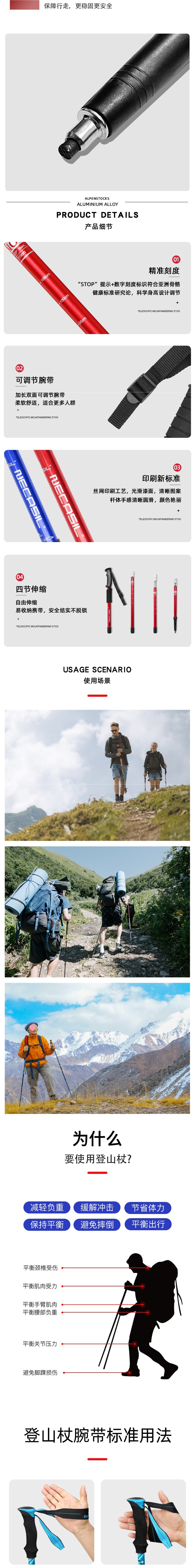 • 4개 섹션 텔레스코픽 | 스트레이트 핸들 레드 50-110cm (충격 흡수 시스템 내장)