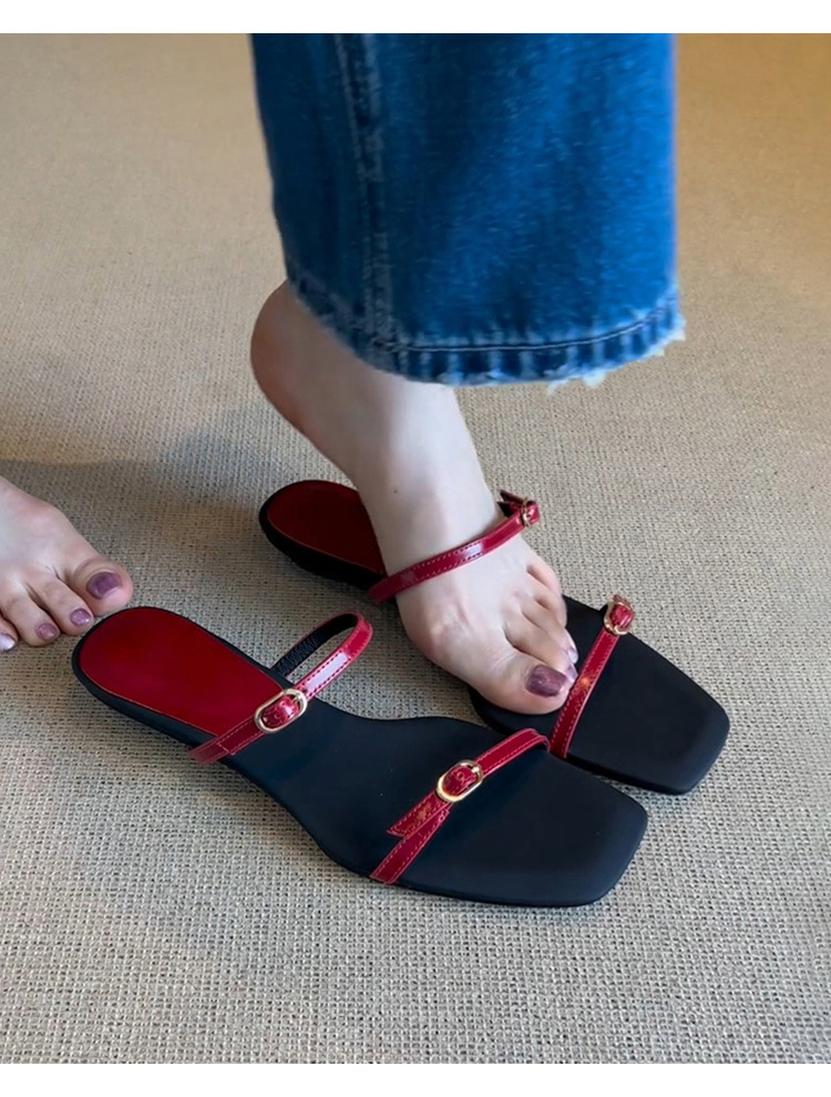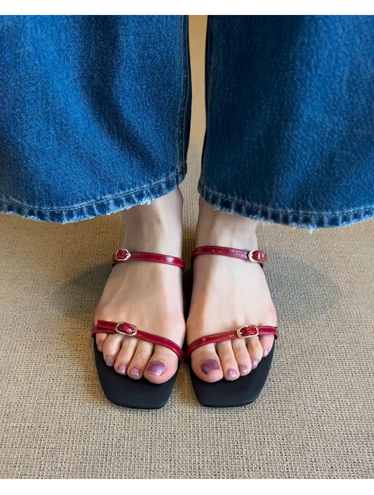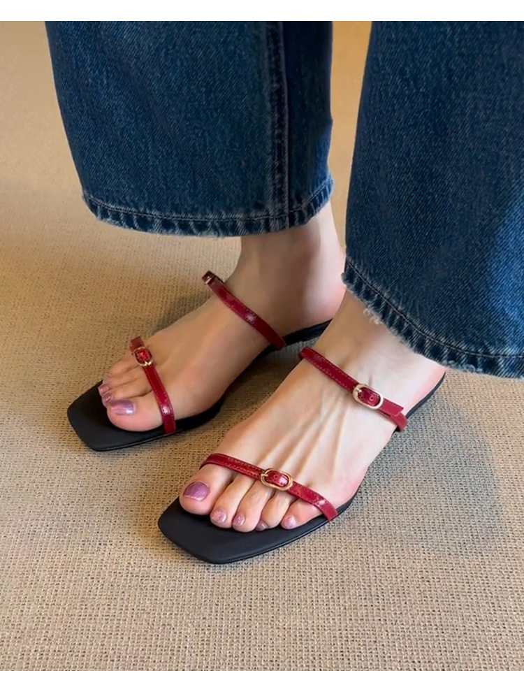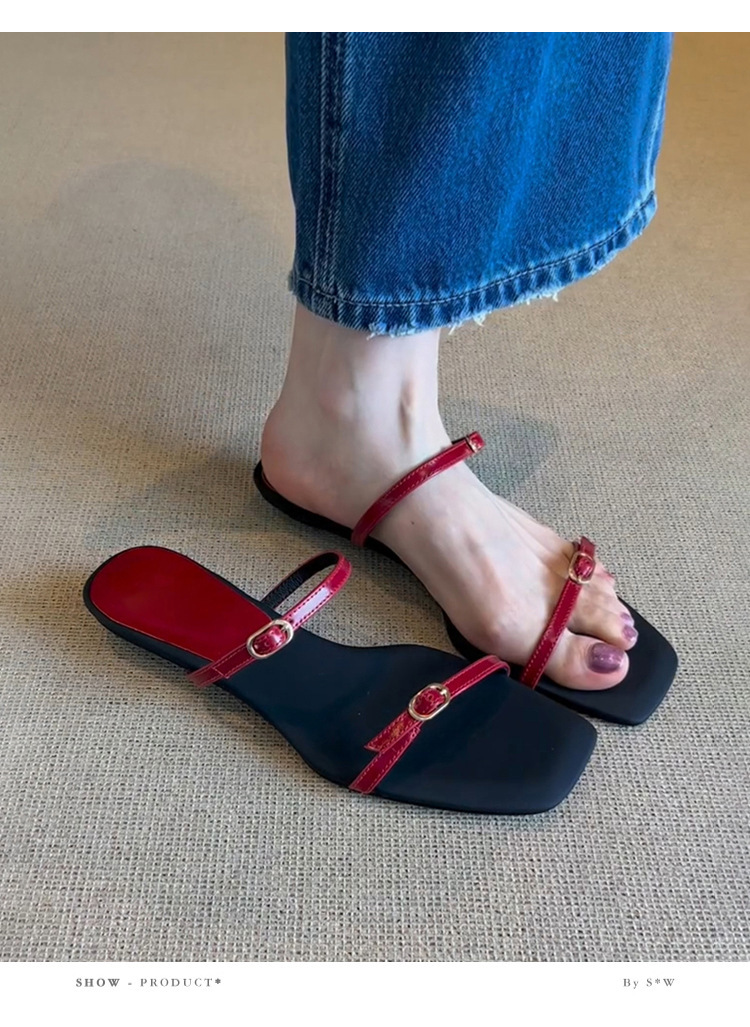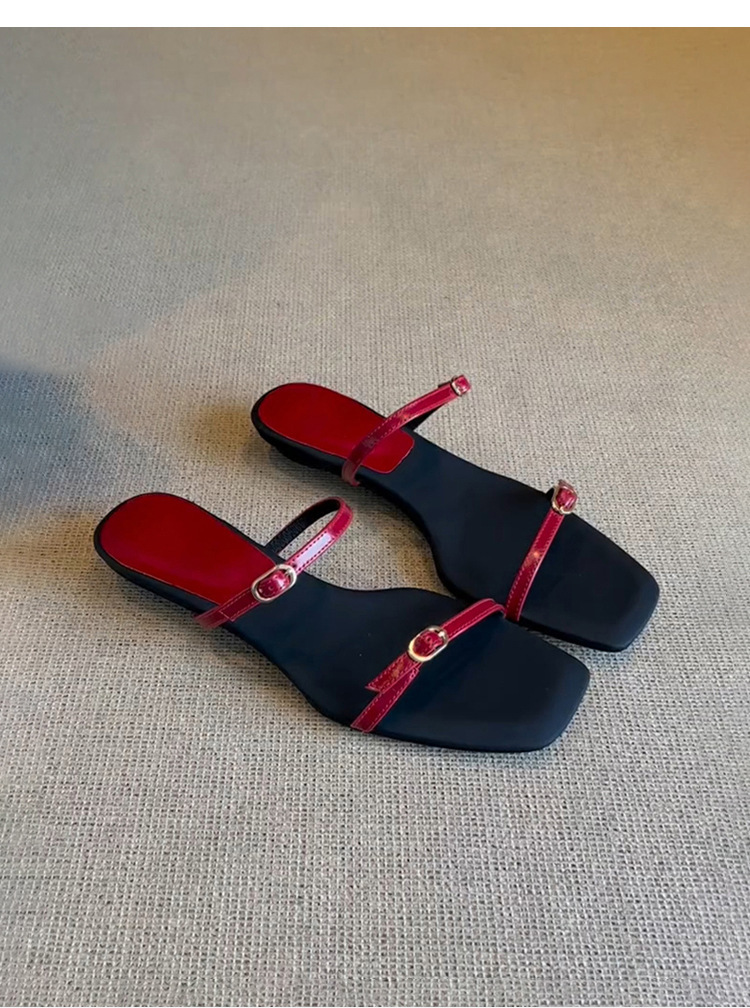 미니멀리스트 복고풍 레드 스타일 슬리퍼 여성용 스퀘어 토 오픈 토 여름 다용도 플랫 샌들
