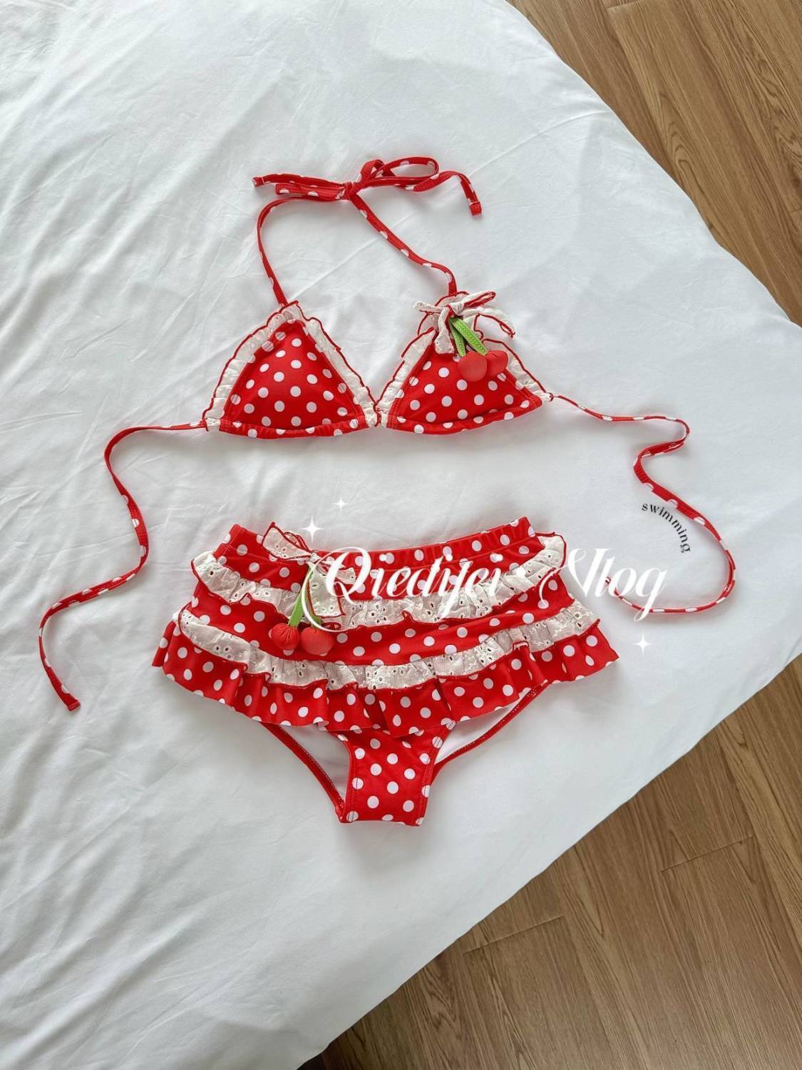 2025 새로운 비키니 스플릿 리틀 체리 3 피스 세트 ins 스타일 순수한 욕망 소녀 귀여운 해변 휴가 수영복