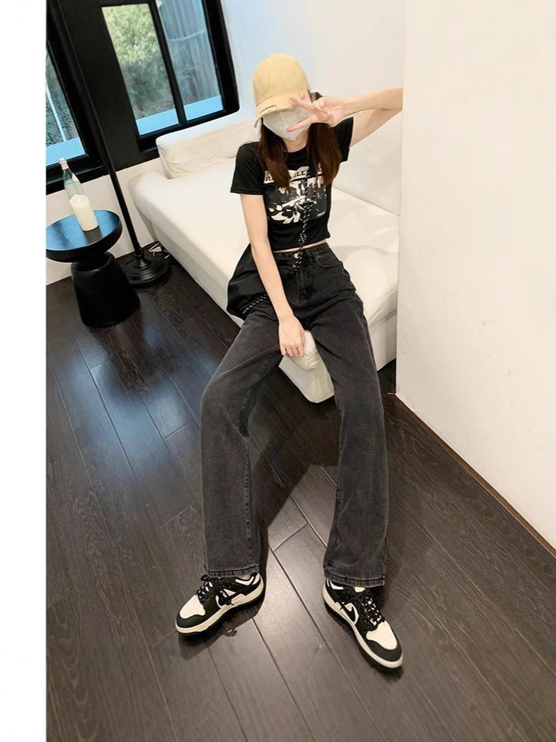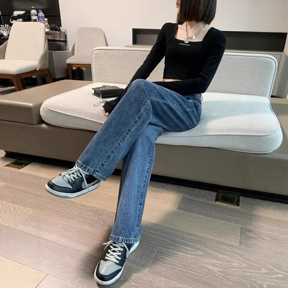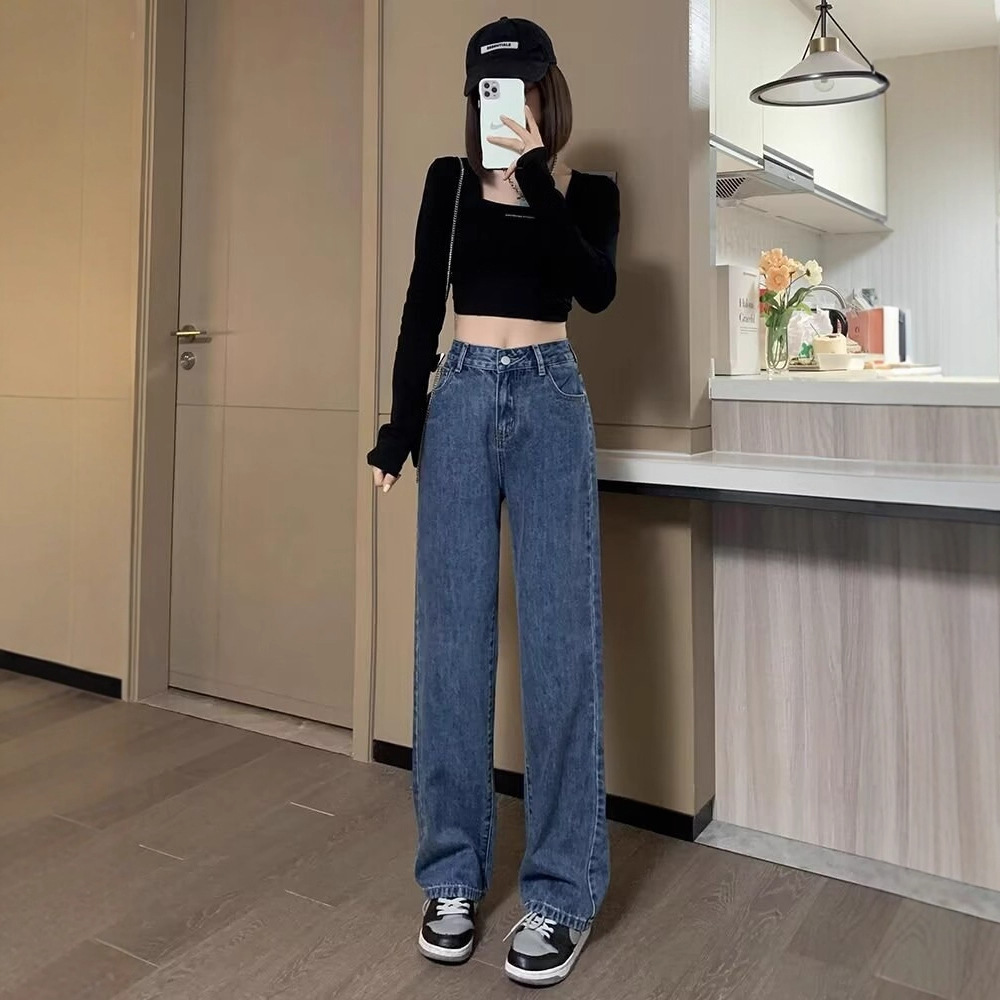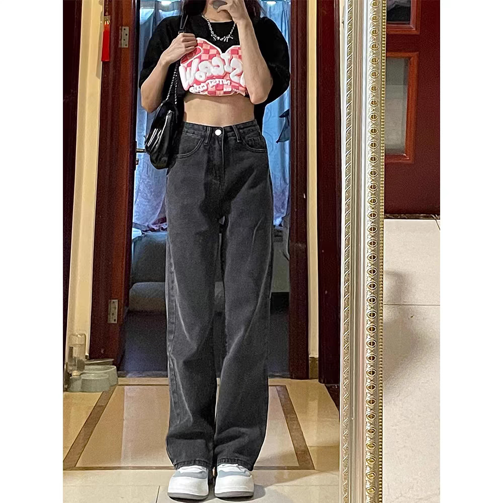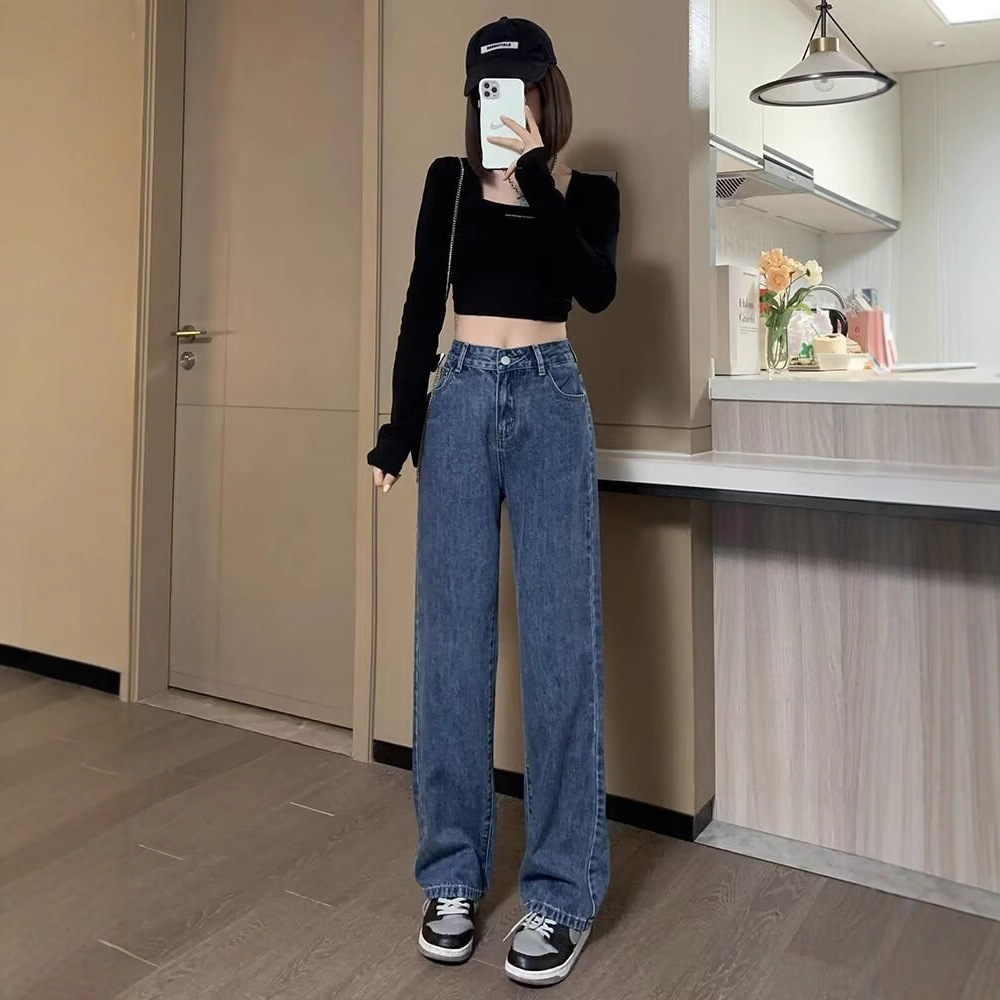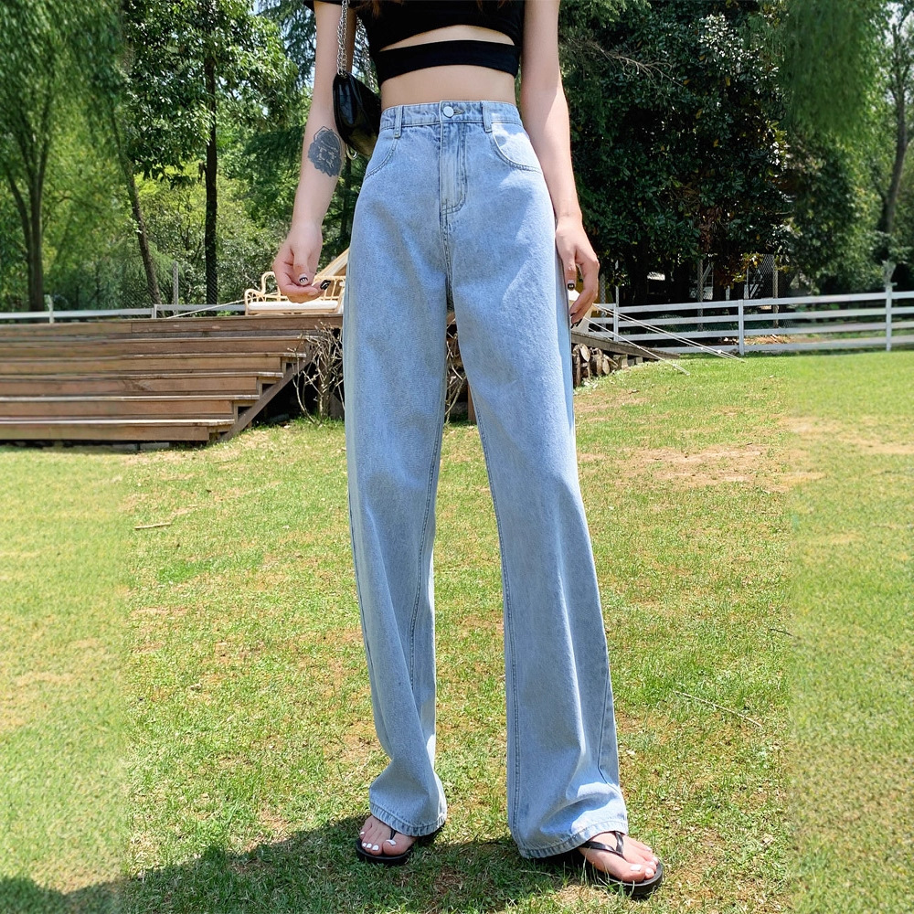 여성을위한 홍콩 스타일 복고풍 하이 웨이스트 와이드 레그 청바지 가을 새로운 여름 트렌드 루즈 슬리밍 스트레이트 바닥 길이 바지